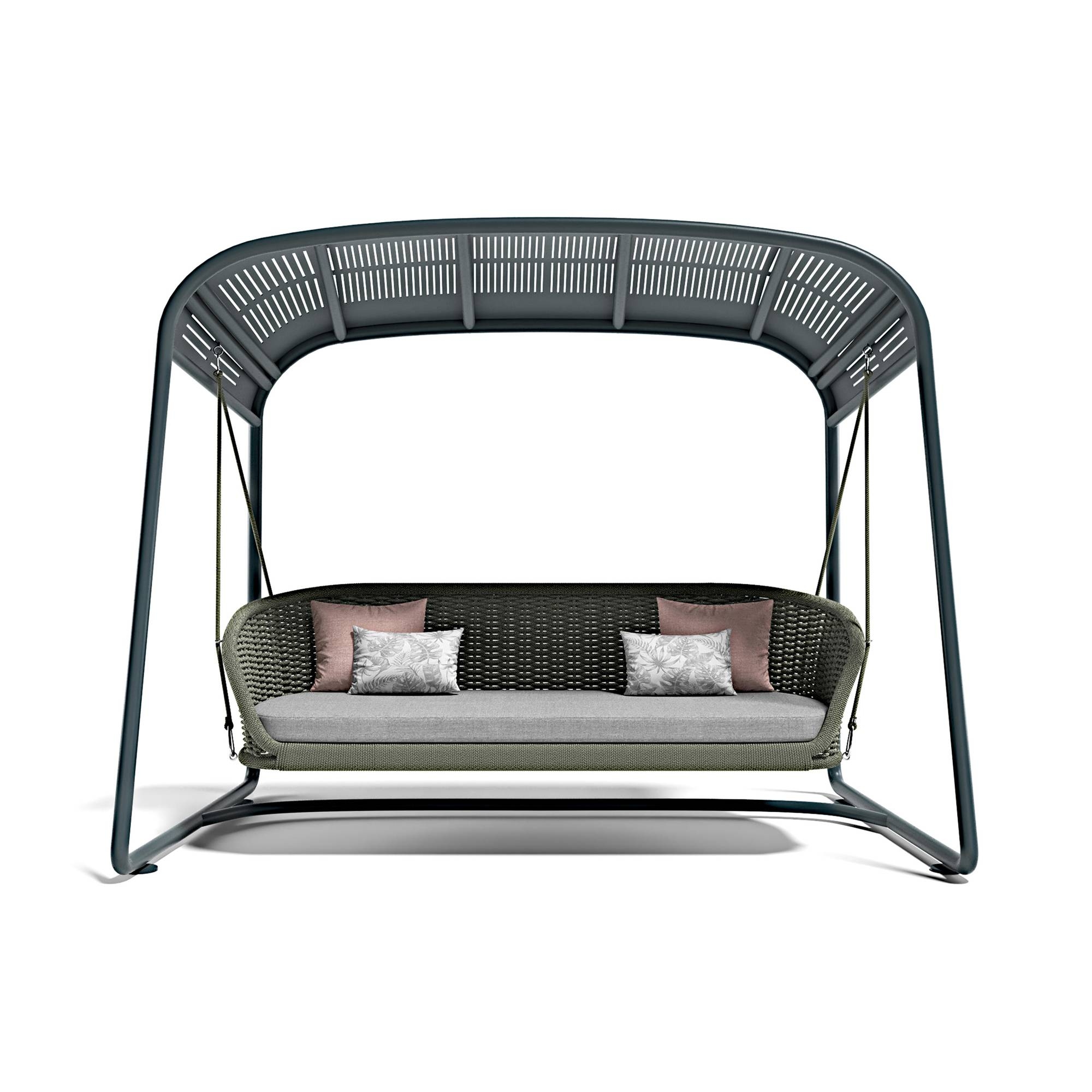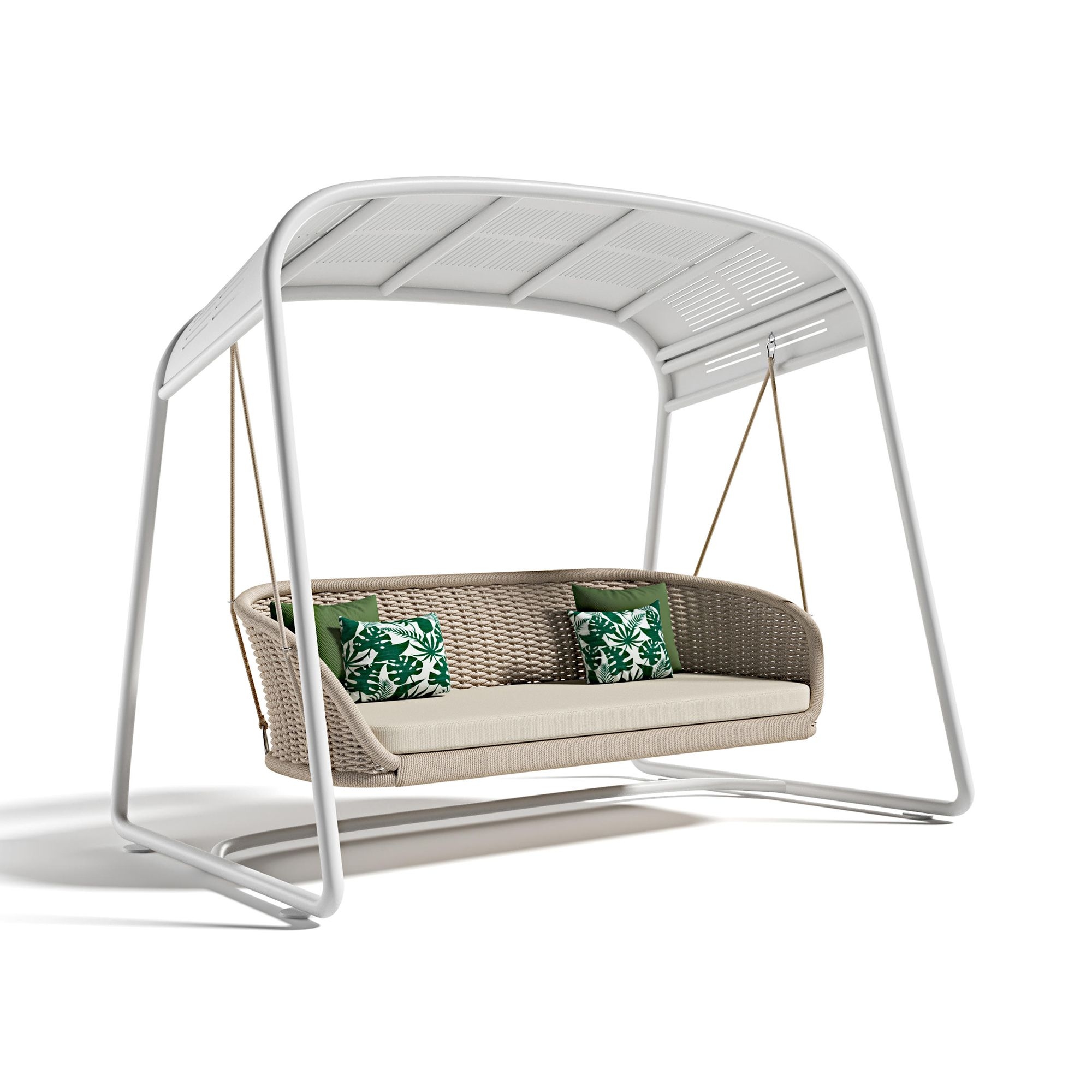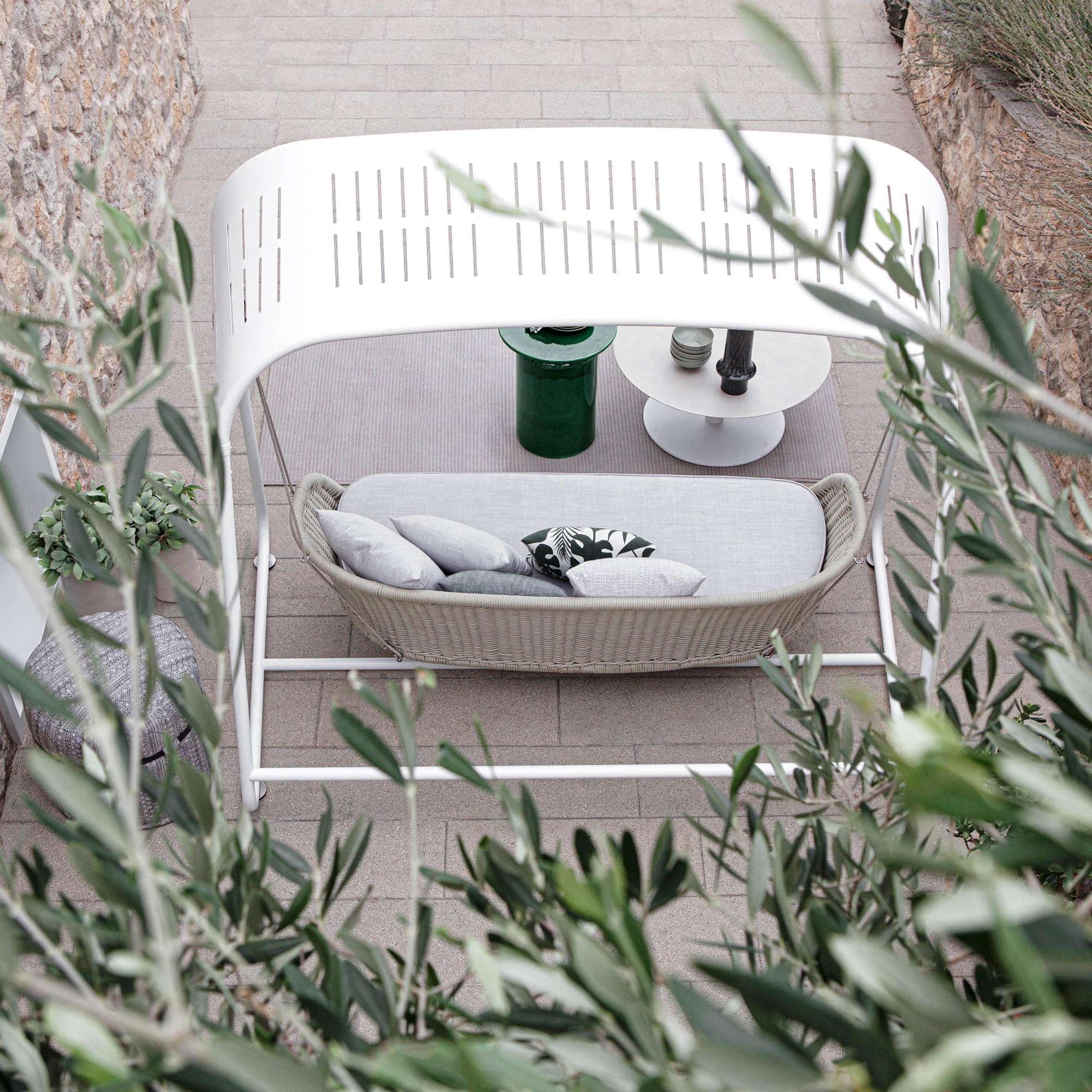 Ludo .L5 rocking sofa with pedestal crafted with a galvanized iron pedestal structure, manually woven rope sofa framework, and a seat cushion covered in outdoor fabric. Available in various colors, the Ludo .L5 rocking sofa is the quintessence of elegance and comfort. Handcrafted workmanship brings to life sinuous shapes that cradle you in a hug of pure relaxation, turning every moment of rest into a unique experience. The warm aesthetics of the Ludo rocking sofa, resulting from a harmonious blend of natural materials and refined design, make it incredibly versatile and easy to match with different interior styles. Whether placed in a contemporary living room or a rustic porch, Ludo fits perfectly, bringing a touch of discreet elegance. The Ludo collection is designed for maximum comfort and functionality. Every detail has been meticulously managed, from the selection of materials to the design of ergonomic elements that ensure unparalleled comfort. The sofa's surface, wrapped in soft and tactile-pleasing ropes, invites you to surrender to deep, rejuvenating relaxation, promising moments of pure well-being. The exclusive Ludo collection also includes armchairs, small tables, lanterns, and rocking chairs, all crafted with the same care and attention to detail that characterizes the pedestal sofa. Each piece contributes to creating a welcoming and relaxing atmosphere, ideal for enjoying your outdoor or indoor space in full tranquility. Choosing the Ludo .L5 rocking sofa with pedestal means diving into an unprecedented experience of comfort and style, characterized by a quality that only craftsmanship and attention to detail can guarantee. Let yourself be seduced by the charm of Ludo and transform your space into an oasis of timeless relaxation and beauty.