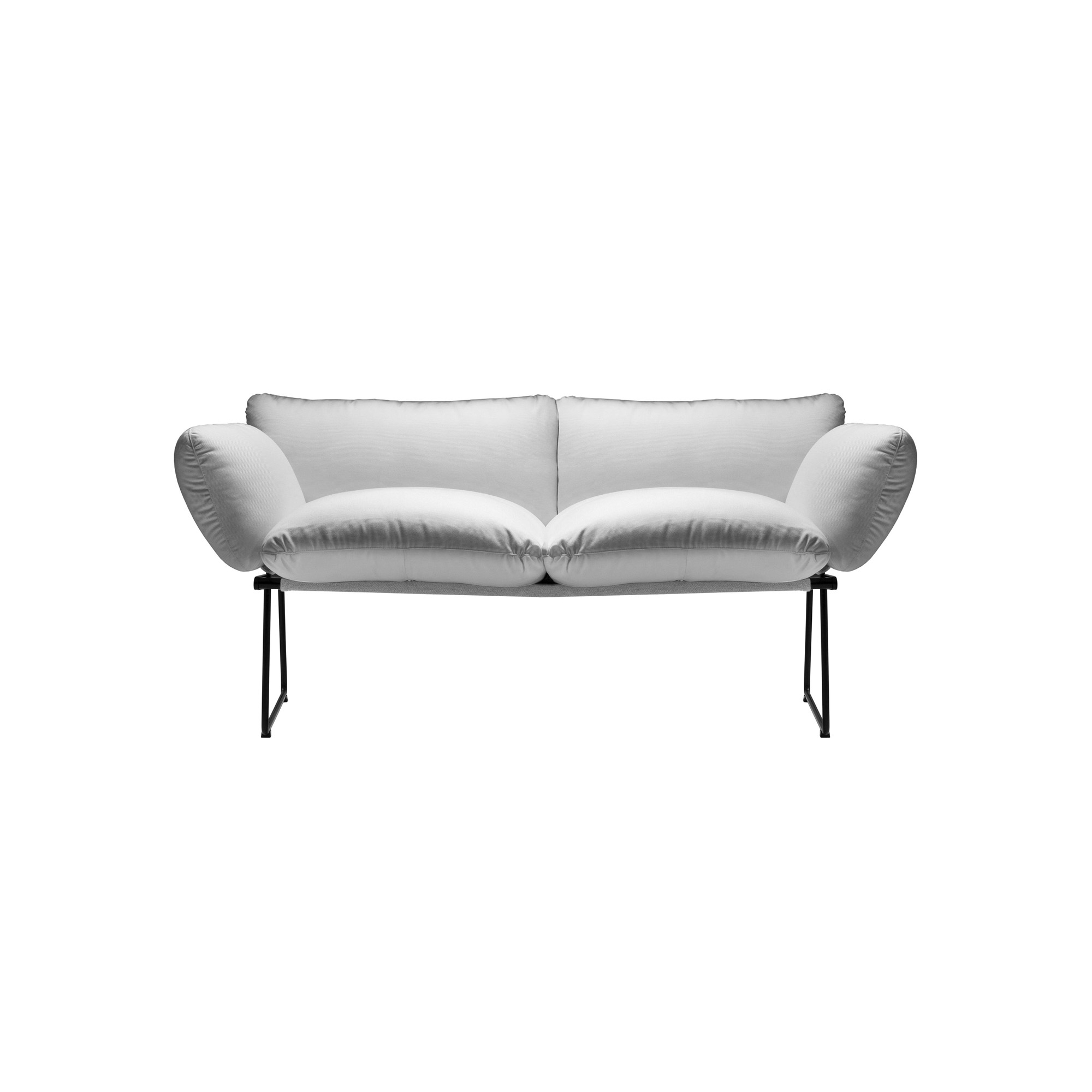 Elisa 2-seater sofa crafted with a black-brown epoxy powder-coated steel structure, variable density polyurethane foam cushions and polyester fiber, featuring a removable fabric covering. For indoor use only. Available in a wide range of colors, the Elisa 2-seater sofa represents an excellent balance between lightness and comfort, with a clean and elegant design. This sofa features a charming and sophisticated silhouette, distinguished by a slender steel structure that pleasantly contrasts with the generous volume of the polyurethane foam cushions. A perfect equilibrium of functionality and style, the Elisa sofa provides an extremely comfortable seating experience, ideal for enhancing any setting with a touch of sophistication. With its broad and inviting cushions, it's engineered to offer unparalleled comfort, encouraging relaxation and repose. The sleek and essential steel base, with its sled supports, imparts an almost suspended appearance, adding a sense of visual lightness to the piece. Ultimately, the Elisa 2-seater sofa is an upscale choice for those desiring a piece of furniture that impeccably combines aesthetics and comfort. Designed by Enzo Mari for Driade.