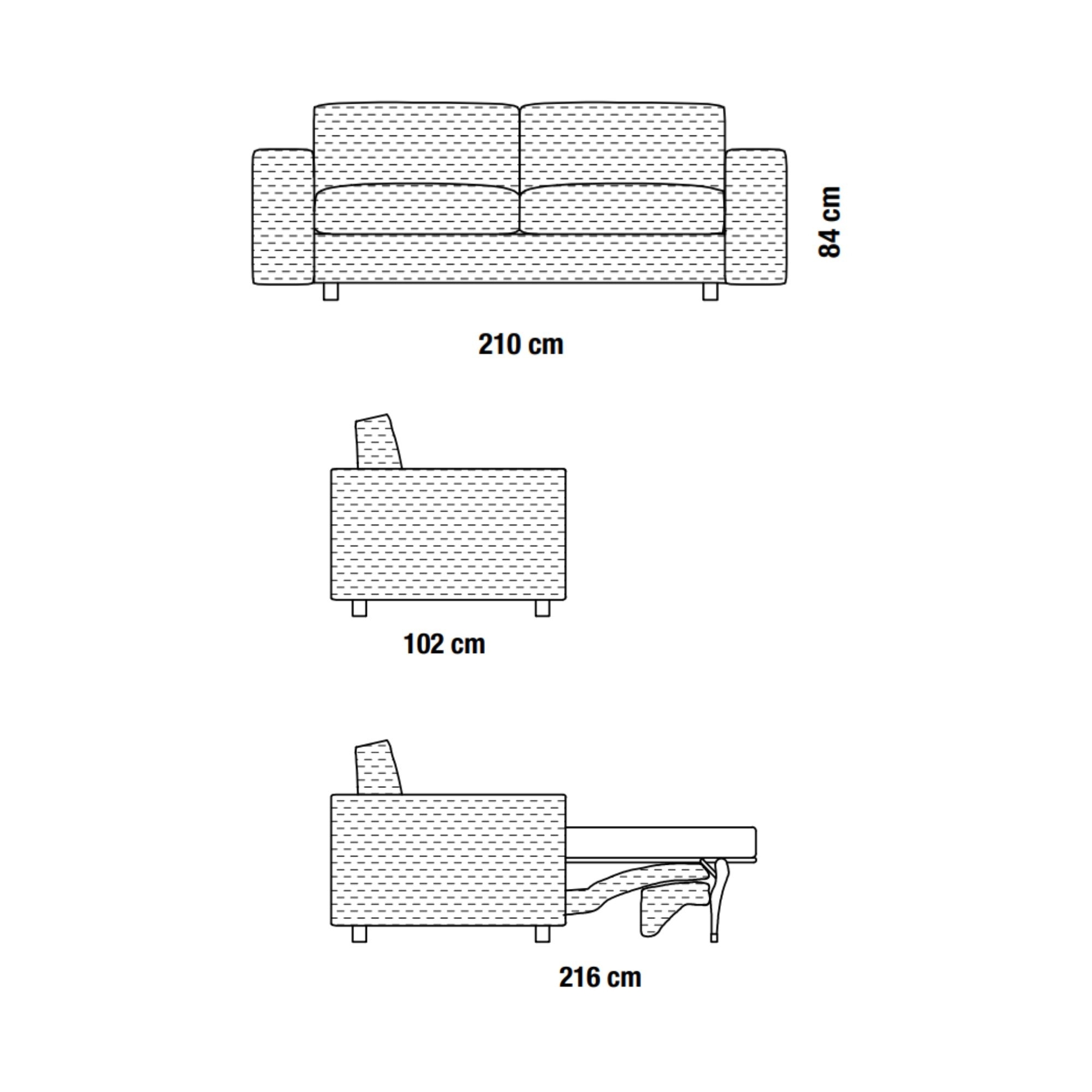 Dimensions: Sofa width 210 cm, Sofa depth 102 cm, Sofa height 84 cm, Bed width 160 cm, Bed depth 216 cm