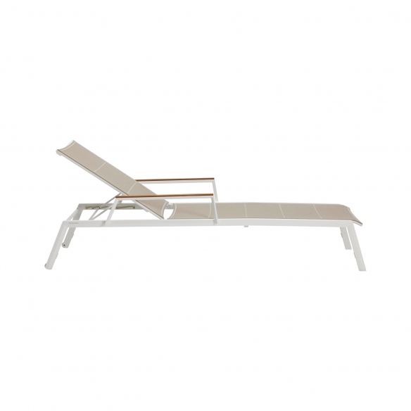 The Selecta lounger with arm Teak features a sturdy structure made of top-quality powder-coated aluminum, with armrests in exquisite Teak wood that ensure comfort and stability, and Batyline fabric that makes it soft and cozy. The Selecta sun lounger is available in three splendid colors, making it ideal for any outdoor setting, from the most classic terraces to the most modern and avant-garde gardens, adding that gentle touch every home needs. Thanks to the choice of unique and high-quality materials, the Selecta lounger with arm teak is resistant to UV rays, rain, and humidity, thus offering an ideal solution for outdoor use. Furthermore, Selecta has an adjustable backrest, which allows finding the perfect position for every relaxation moment; from an upright seat for reading a book to a fully reclined one for sunbathing. A special feature of this wonderful jewel is that it is stackable, meaning it is designed to be piled up with other loungers to save space. The Selecta lounger with arm teak is not just a sun lounger; it is a true symbol of luxury and comfort.