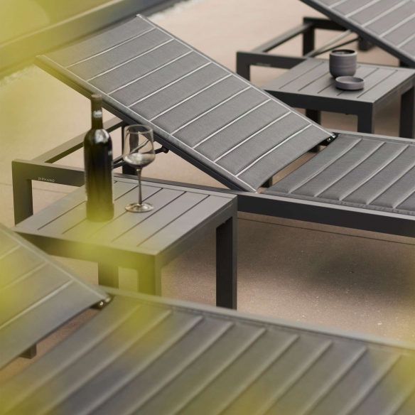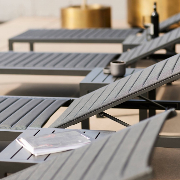 The Metris lounger with cushion is a jewel that promises maximum durability thanks to its robust aluminium structure and also to the double layer of Textilene fabric of the cushion, designed to offer unparalleled comfort. Available in two elegant combinations, Metris perfectly fits any style, from the most modern gardens to the simplest or classic outdoor terraces. Metris outdoor has been designed with an intuitive adjustment mechanism that allows you to adjust the backrest, thus ensuring the ideal position for every moment of relaxation, be it reading a book, sunbathing, or simply enjoying the sounds of nature in delightful tranquility. The Textilene cushion promises to be resistant to water and UV rays, perfect for placement at the edge of a pool. The Metris outdoor lounger with cushion is an ideal choice for those who need to weave functionality and aesthetics. Metris is not just an outdoor furniture piece, but rather an invitation to rediscover peace and comfort, creating an oasis of well-being.