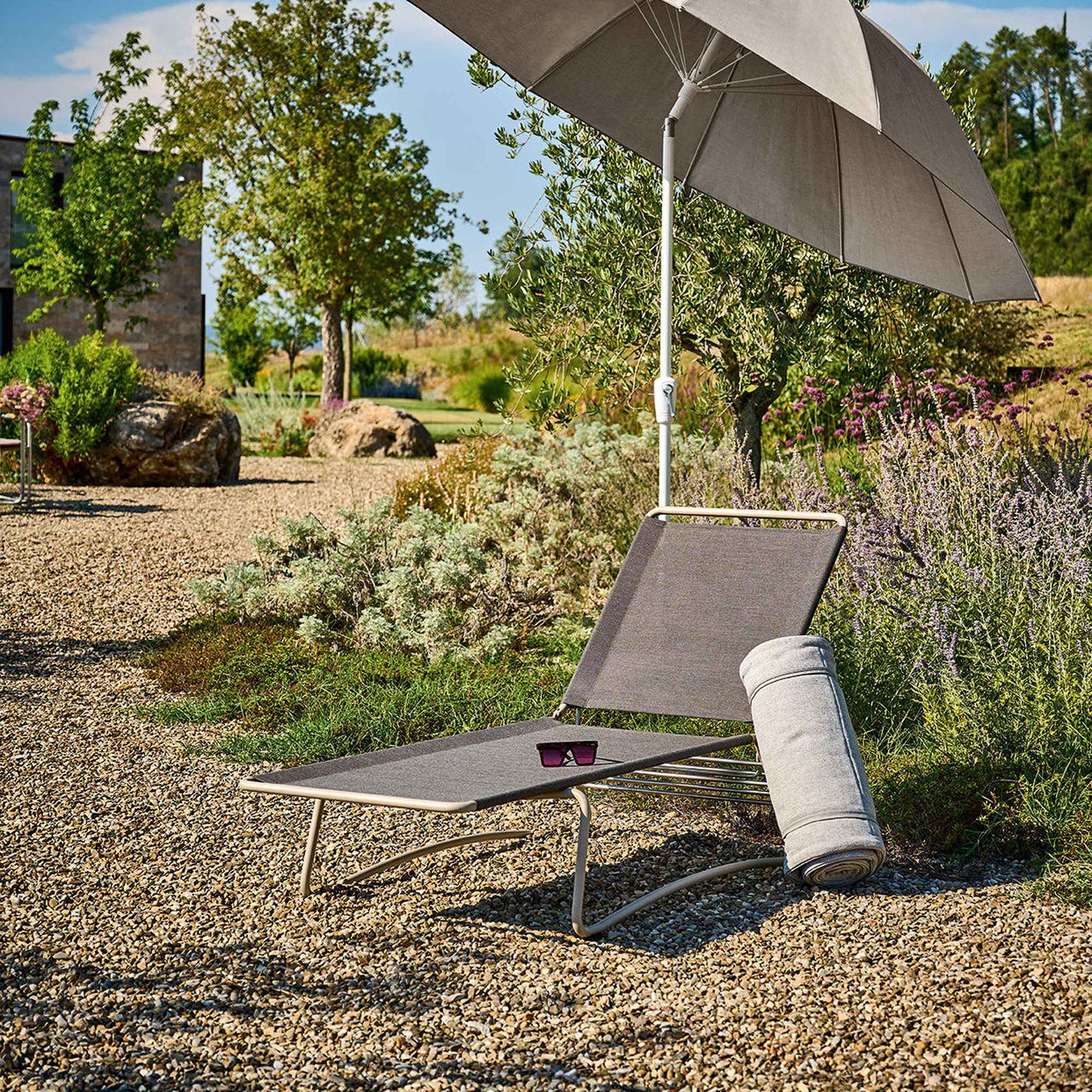 The Balcony outdoor sun lounger, crafted with an aluminum or powder coated steel structure and Batyline back seat, presents a perfect embodiment of luxury and comfort, designed to make your outdoor relaxation moments unforgettable. Available in various color combinations, the Balcony outdoor lounger is crafted with high quality materials, featuring a frame in aluminum or painted steel, chosen to ensure maximum durability and resistance to weather conditions. The comfortable seat, available in various colors, is made from Batyline outdoor fabric, engineered to deliver maximum comfort while being extremely easy to clean and maintain. Whether you're reading a book, enjoying a relaxing afternoon, or simply admiring the sunset, the Balcony outdoor lounger offers you the maximum in comfort and style. With its timeless design and undeniable practicality, it will prove to be a valuable and essential investment for enhancing the quality of your outdoor moments. Designed by Thomas Albrecht for Weishäupl.