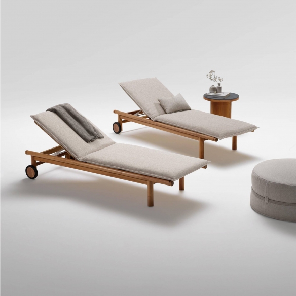 The Apache outdoor lounger, crafted with a natural teak structure and an additional outdoor fabric cushion, epitomizes the perfect balance between purity, simplicity, and elegance. The outdoor Apache lounger stands out for its cylindrical structure, enriched by a groove that becomes the distinctive detail of the entire collection. Designed to ensure the utmost comfort and style, the Apache lounger features a solid teak seat, meticulously slatted, equipped with a handle to facilitate transportation. The intuitive design is further enhanced by the optional padded cushion, available in all the fabrics of the collection, promising uncompromising rest and relaxation. Practicality is emphasized by the presence of wheels and a handle, ensuring easy movement, thus allowing the Apache lounger to be placed in any outdoor context with maximum convenience, from the garden to the terrace. The innovative design and high-quality materials harmoniously combine to create a unique outdoor resting experience, making every moment of relaxation a true pleasure. Designed by Atmosphera Creative Lab.
