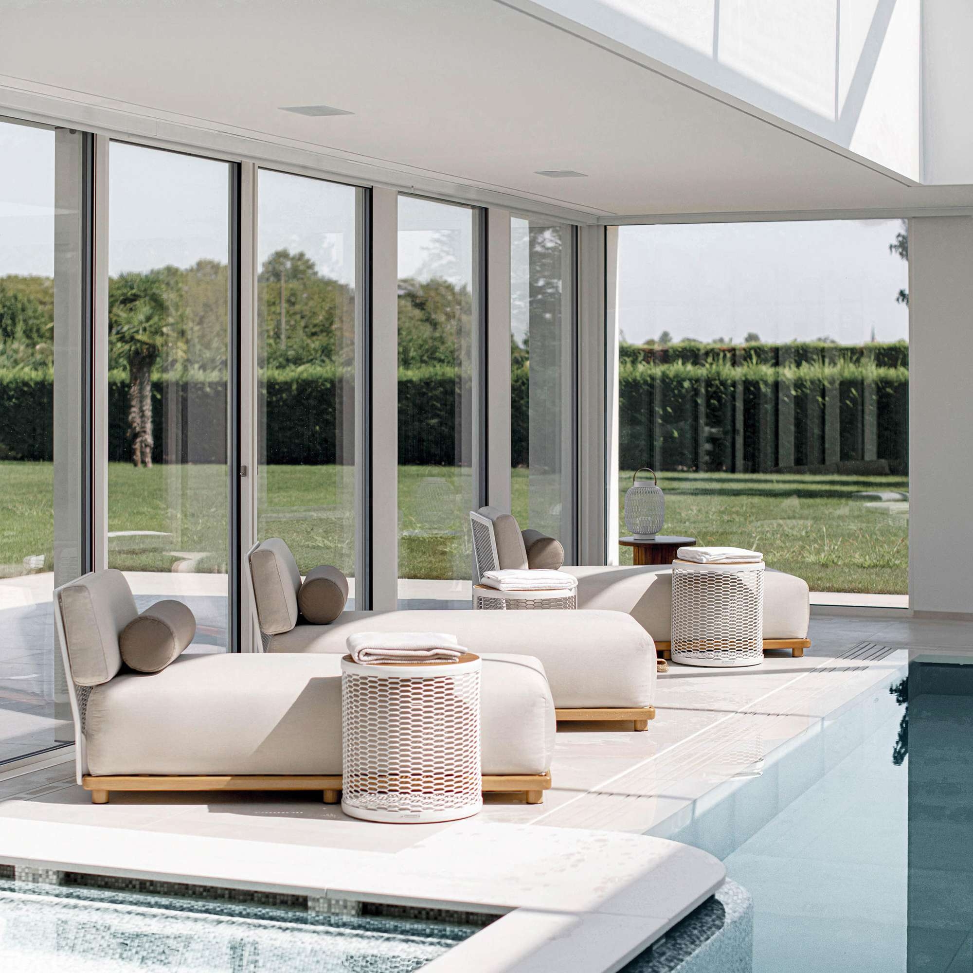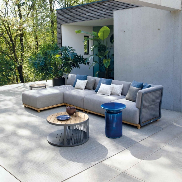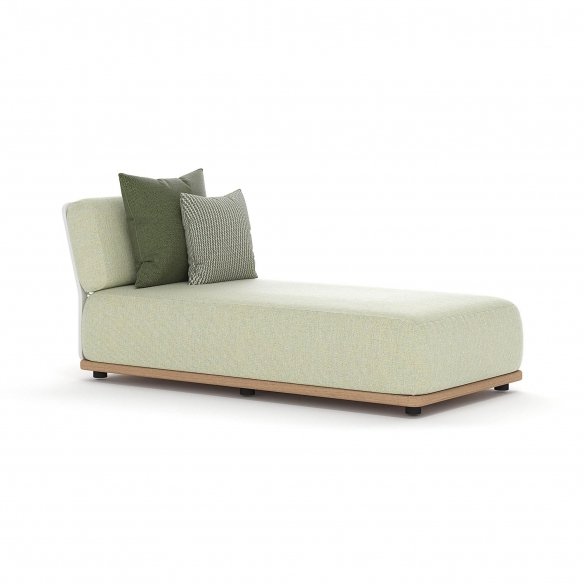 The Switch sofa lounger module, crafted with an aluminum structure, a teak-tinted base, and cushions for the seat and back upholstered in outdoor fabric, is designed for both integration in outdoor settings and seamless continuity with indoor design themes. Meeting the needs of those unwilling to compromise on elegance even in outdoor spaces, the Switch lounger module blends high-quality materials into a vision of contemporary outdoor furniture that boasts modularity and customizability, making each configuration unique and personal. Versatility is at the heart of the Switch concept: starting with a single lounger module, it's possible to add other elements from the same collection to create tailor-made solutions that perfectly fit any outdoor space, whether a private garden, a panoramic terrace, or an exclusive hotel lounge area. The Switch sofa lounger module invites a reinterpretation of outdoor space as an extension of daily living, in a remarkable mix of technology, design, and functionality. Elegant, modern, and customizable, this piece will become the centerpiece of your outdoor relaxation oasis. This outdoor design gem is a creation of the Atmosphera Creative Lab, which once again sets new standards of beauty and comfort, enhancing the pleasure of outdoor living.