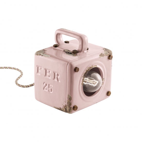 C1650 table lamp made of ceramic with cor-ten antiqued iron details and covered cotton cable. Perfect for domestic and contract environments, the C1650 table lamp has a lighting body that recalls a classic projector or a briefcase, all embellished with a peculiar finish with a rust effect deliberately recreated on the ceramic. Combine several elements together and create a unique atmosphere in both a living room and in the hallway and personalize your environment with a retro touch. Light source 1x77W E27 - IP20. Designed and built by Ferroluce.