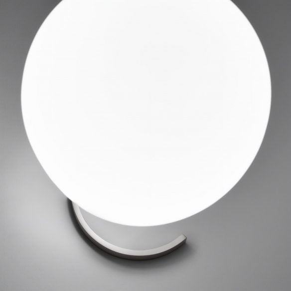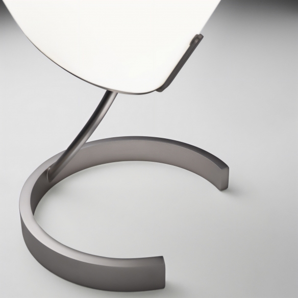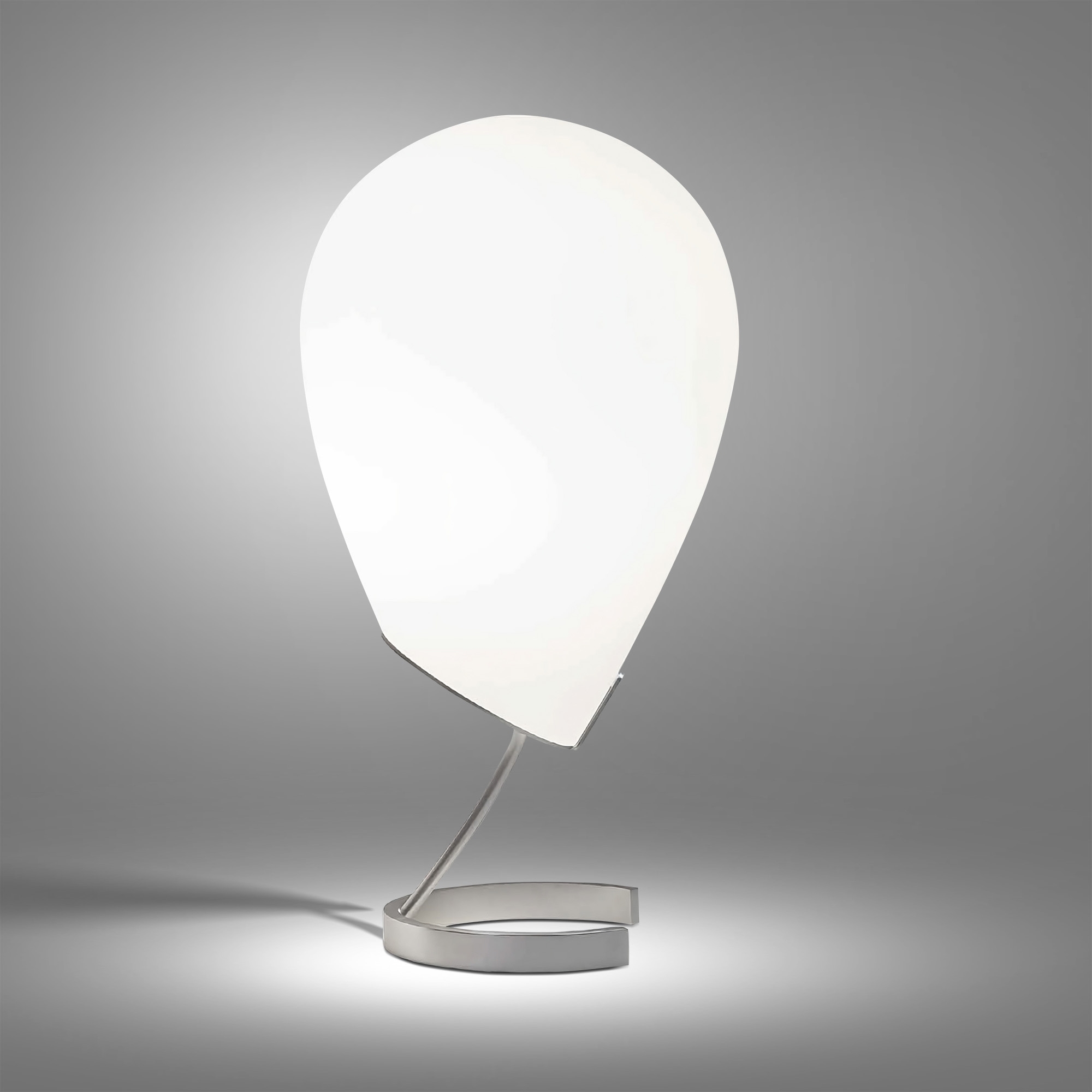 Equilibrio table lamp "small" version made with steel base and acid-etched opaline blown glass diffuser. Characterized by a magical and refined design, the Equilibrio table lamp stands out for its elegant diffuser, which seems to float in space. The glass rests on a steel structure, in a stable and safe balance, which defies gravity. The lamp diffuses a soft and enveloping light, which creates an atmosphere of harmony and serenity. Designed by Michele De Lucchi for Firmamento Milano.