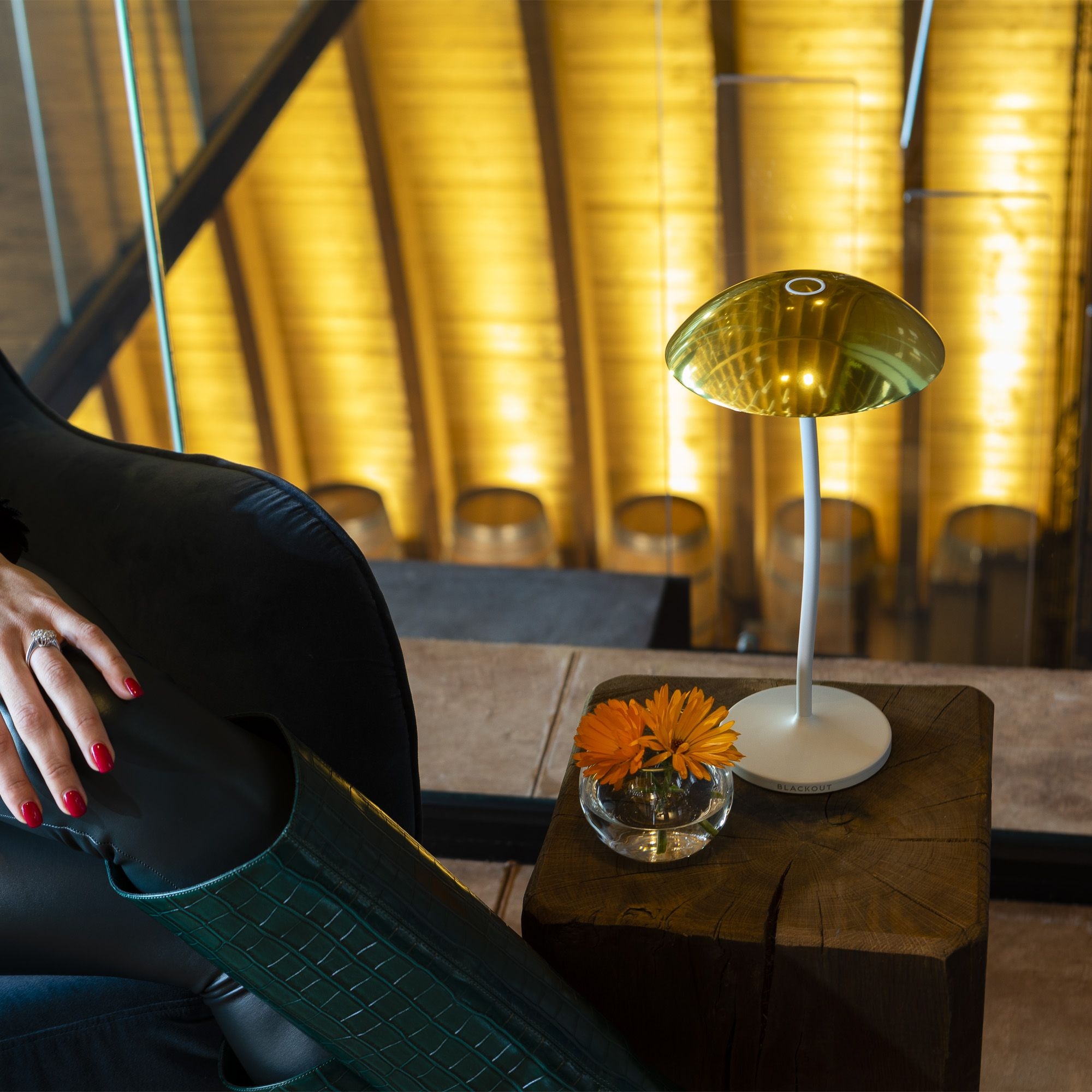 Stem table lamp made of aluminium, ABS and PC. Available in 3 colours, the Stem table lamp is a design jewel inspired by nature. With its harmonious shape and sinuous lines, it evokes the silhouette of a mushroom, transforming any environment with its warm and welcoming light. Perfect for an informal but elegant environment. Designed by Marcantonio for Blackout