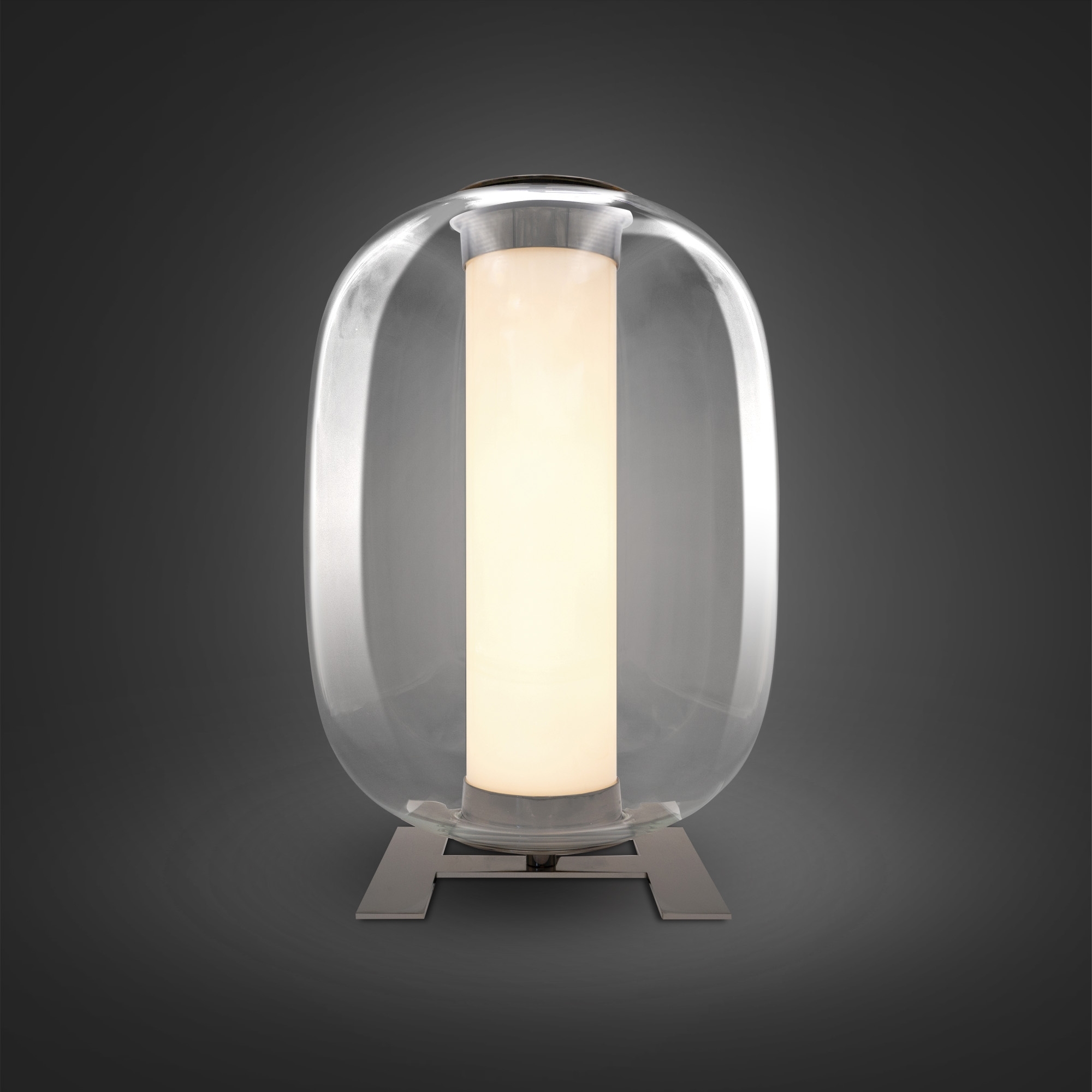 The Meridiano table lamp by Fontana Arte has been crafted with a nickel-plated metal structure, an outer diffuser in blown glass, an inner diffuser in Pyrex glass painted on the inside, and represents the apotheosis of design. Available in three exquisite chromatic finishes, the Meridiano table lamp merges innovative design with artistic quality, seamlessly blending with any style of decor, from a minimalist living room design to a modern and avant-garde bedroom style. The unique design of Meridiano is characterized by a transparent glass capsule that encases the light source, creating a sophisticated and modern aesthetic effect. The ability to be used individually or in multiple configurations arranged in clusters allows it to adapt to different spaces and lighting needs, making it an ideal solution for residential and exhibition environments. Fontana Arte continues to offer solutions that not only illuminate spaces but transform them, making the Meridiano table lamp a perfect example of their design philosophy. Light source: LED 25W (2700K, CRI>90, 2900Lm). Designed by Gabriele and Oscar Buratti for Fontana Arte.