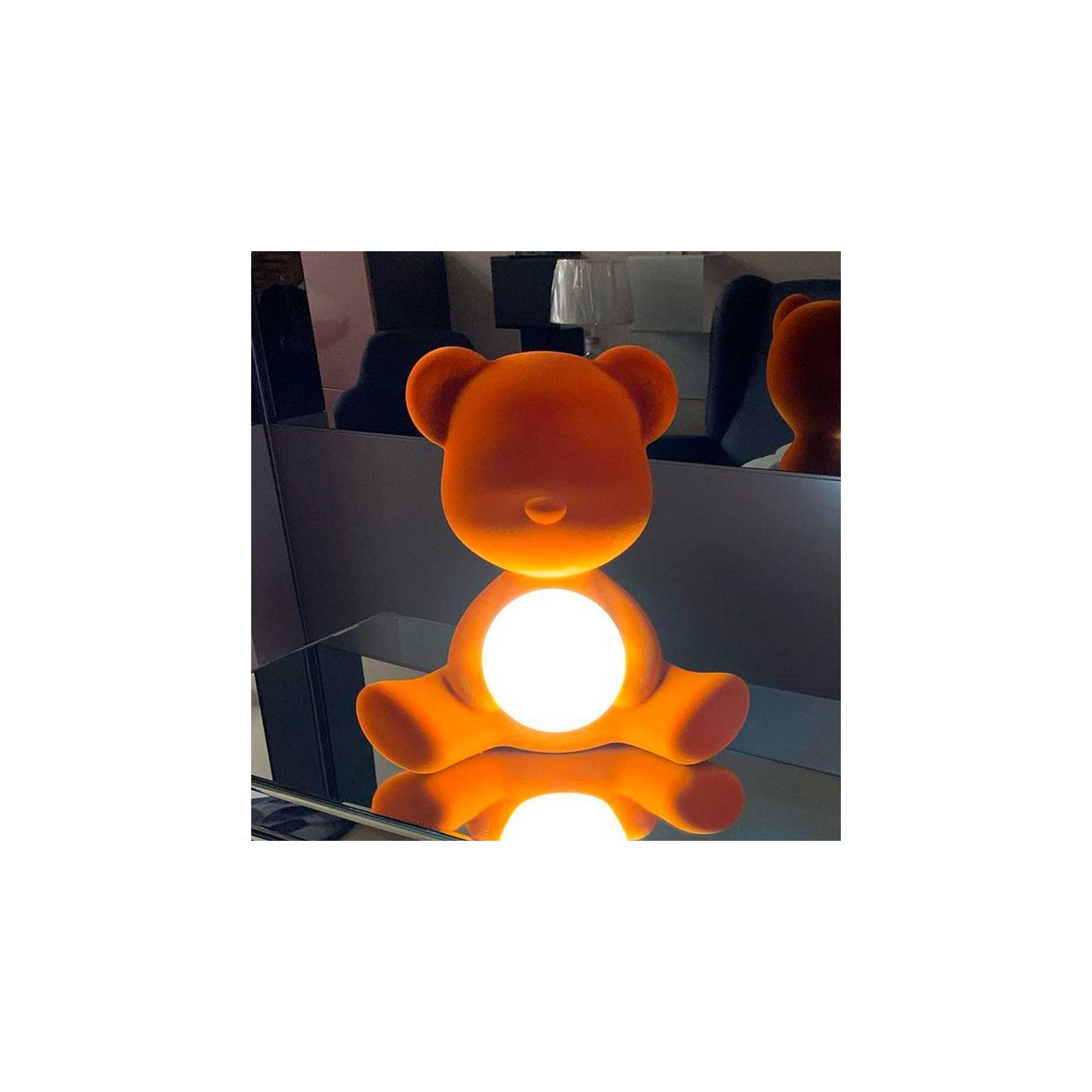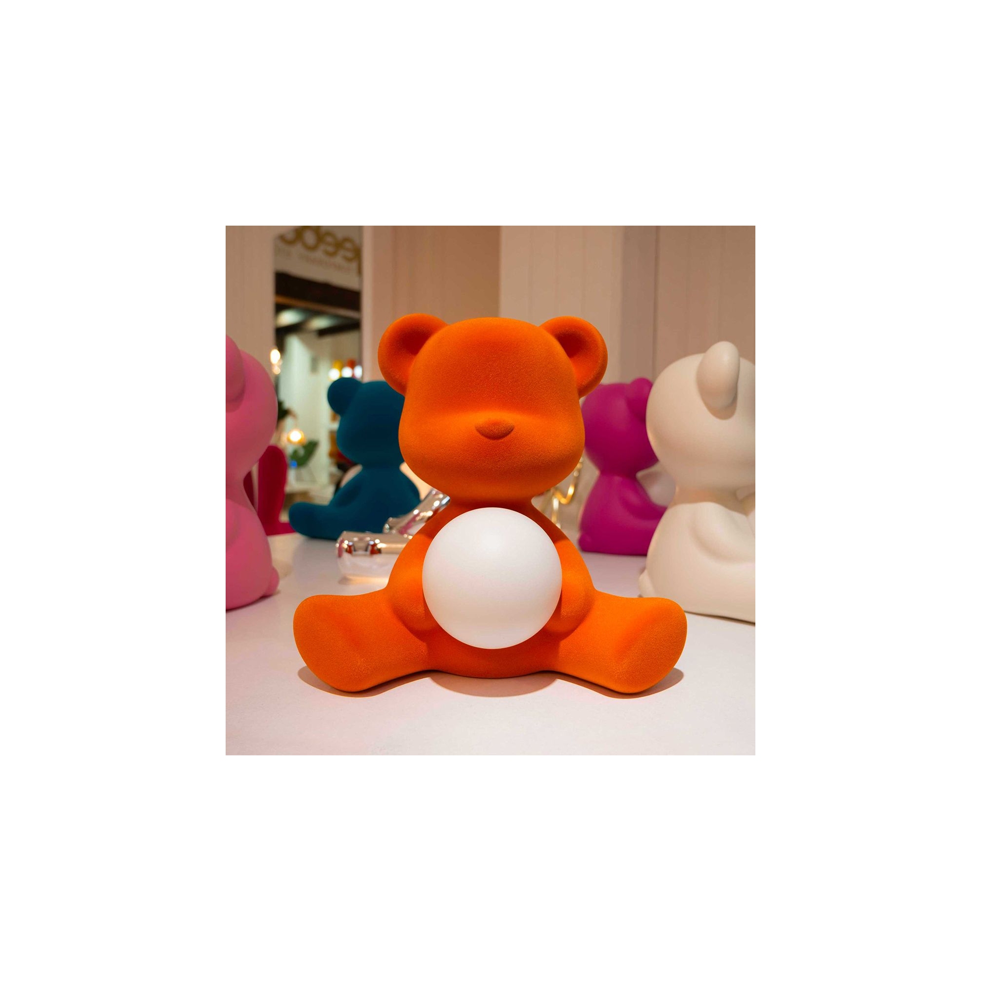 The Teddy Girl rechargeable lamp, in a Velvet finish, is a wireless table lamp that embraces a small luminous sphere; created by Qeeboo entirely from recyclable polyethylene, this lamp promises durability and longevity, making it perfect for daily use. The Teddy Girl lamp features a whimsical and sweet design and comes in six wonderful combinations, allowing for the highest level of customization when purchasing, and then placing it according to the user's needs in any space around the home, from the living room to a child's bedroom. Moreover, this lovely lamp is equipped with LED light technology, capable of creating a soft and inviting glow without any additional energy consumption. The velvet finish gives the lamp an absolutely soft feel, pleasant to the touch. This rechargeable lamp is ideal as a night light or as an ambient lamp but also acts as a fantastic decorative element that celebrates creativity and playfulness. Designed by Stefano Giovannoni for Qeeboo.