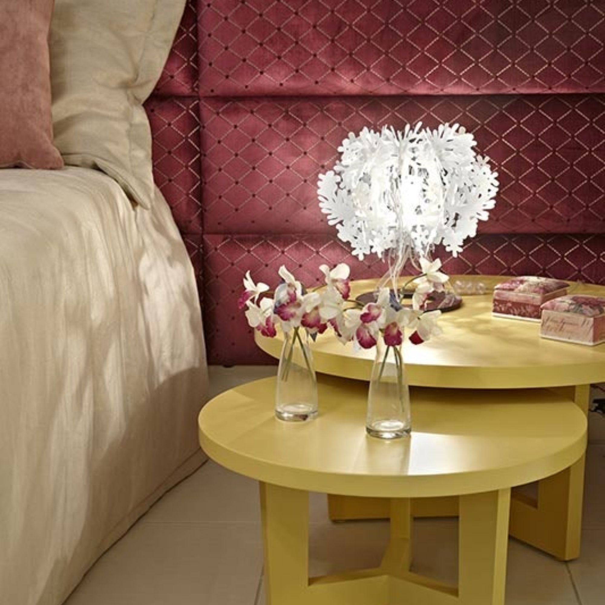 The Fiorellina table lamp is a true gem crafted by Slamp in Opalflex®, a material that ensures durability, elegance, and longevity. This exquisite table lamp boasts a seductive and decorative design that seamlessly integrates into any setting and style of decor: whether placed on a bedroom nightstand, a study desk, or as a centerpiece in a living room, the Fiorellina adds a touch of sophistication and emits a warm, welcoming light. Its shape is reminiscent of a freshly bloomed flower, with delicate petals that appear to dance around the light source, casting a soft and enveloping glow. The petals light up, creating an endless sequence of shadows and reflections projected into the space. The Fiorellina table lamp is a style icon. It's ideal for design enthusiasts who wish to enhance their environment with an object that is both a source of light and a work of art. Designed by Nigel Coates for Slamp.