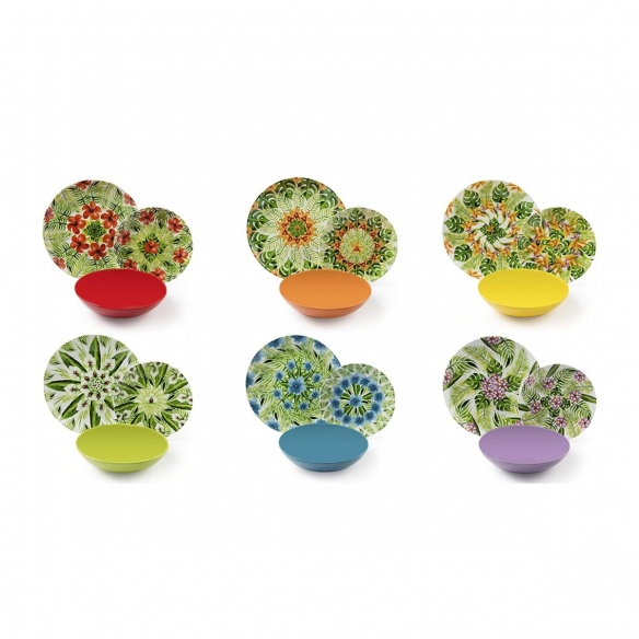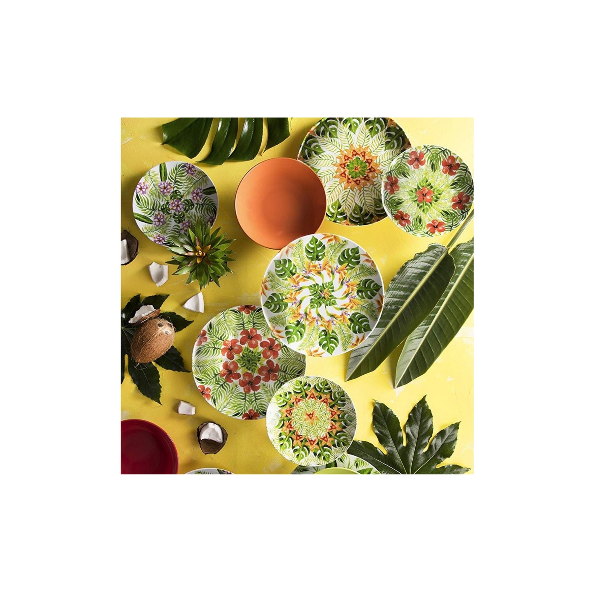 Set of 18 plates, belonging to the Mandala Tropical collection, made of porcelain and stoneware. The service includes:
