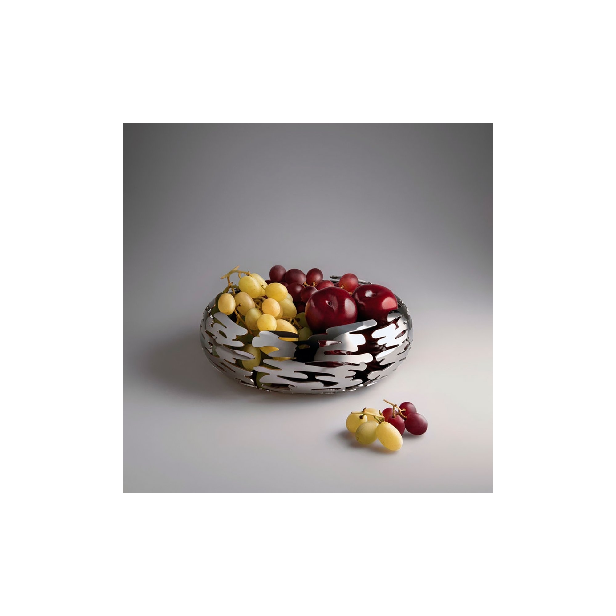 Barknest basket made of 18/10 stainless steel with glass container. Elegant and minimal, this basket in name and form, recalls a cosy nest with rounded walls for holding and safeguarding precious contents. The highly expressive design of this object enhances any room where it is displayed. Designed by Boucquillon & Maaoui for Alessi