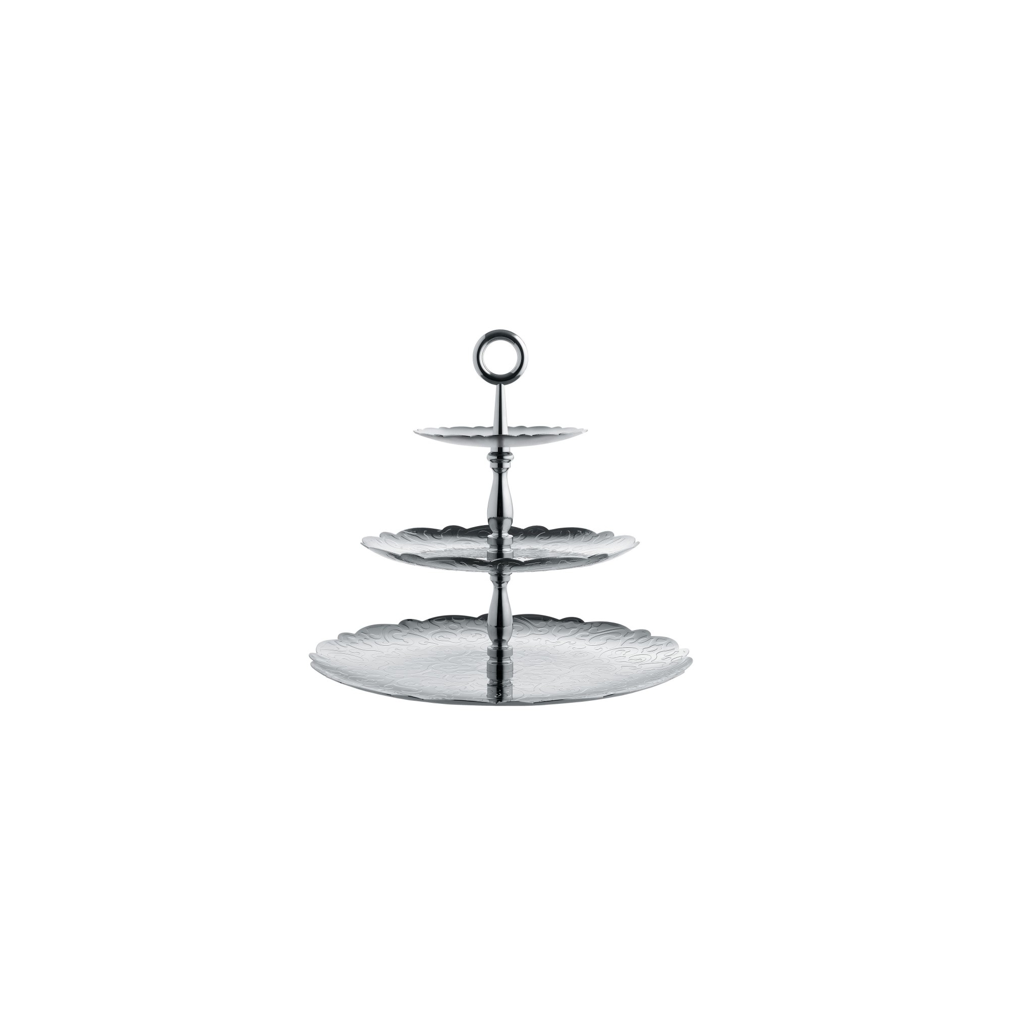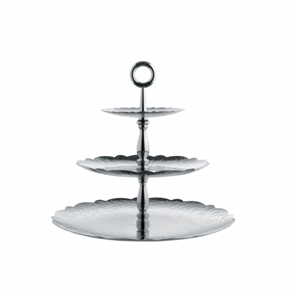 Dressed three-dish cake stand made of 18/10 stainless steel with relief decoration. Perfect for serving amazing composition thank to the three dishes. Dressed stand turns out for the decorative value. Ideal for dinner or formal lunch, dressed stand allows you to show muffins, biscuits, cakes or cupcakes with style. Designed by Marcel Wanders for Alessi.