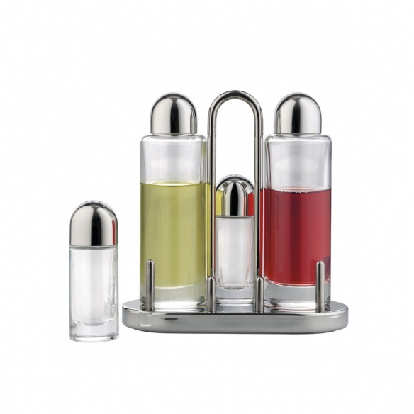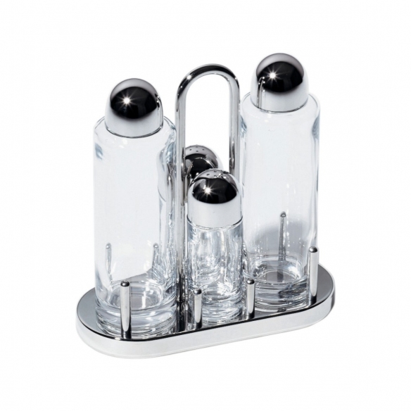 5070 condiment set made of 18/10 stainless steel and glass. Very small and compact, this fantastic condiment set is part of the historic Alessi production. Ideal for both home and professional use (thanks to the design that distinguishes it), the 5070 condiment set can be compared to a luxury object, thanks to the quality and shine of the materials that make it present as a small jewel. Designed by Ettore Sottsass for Alessi.