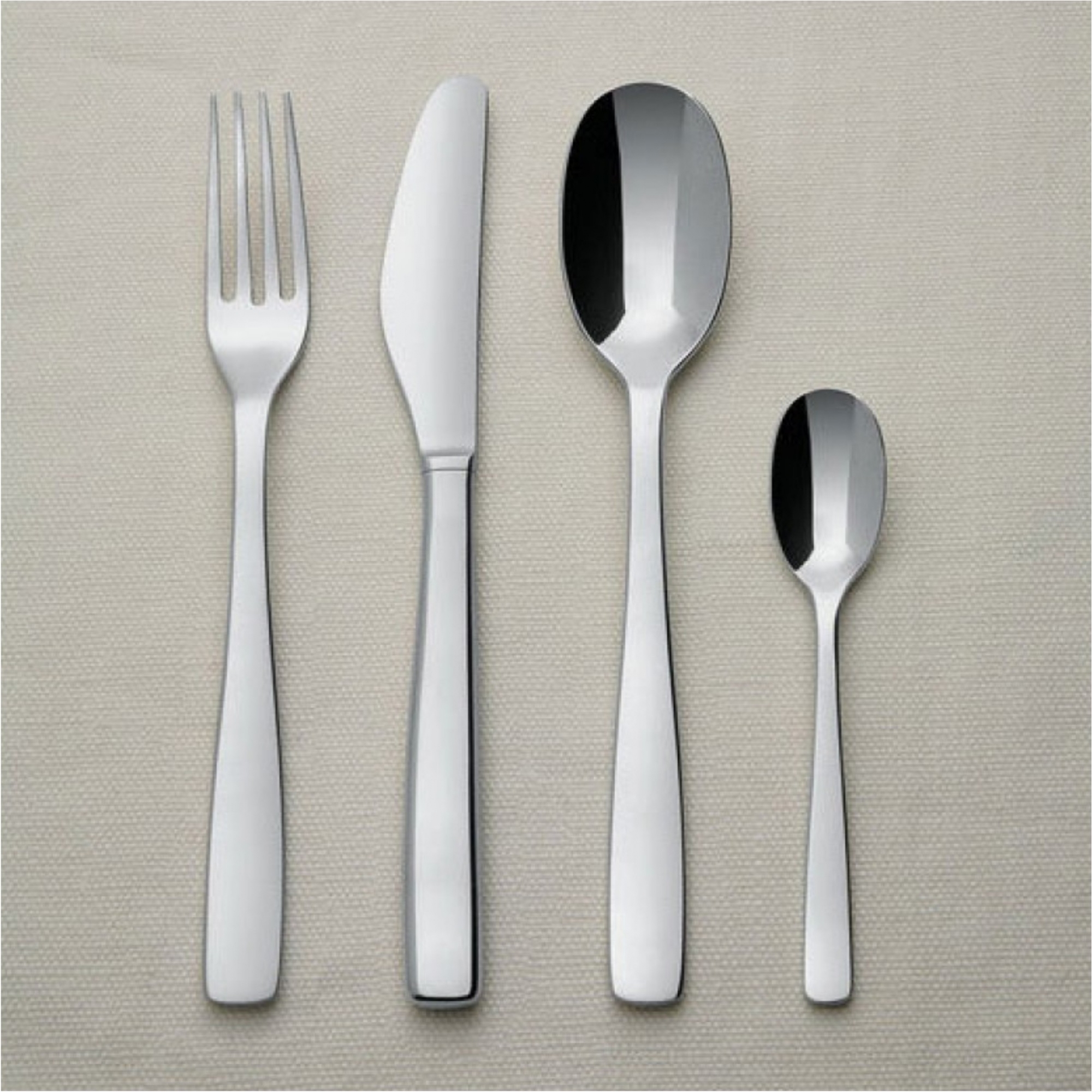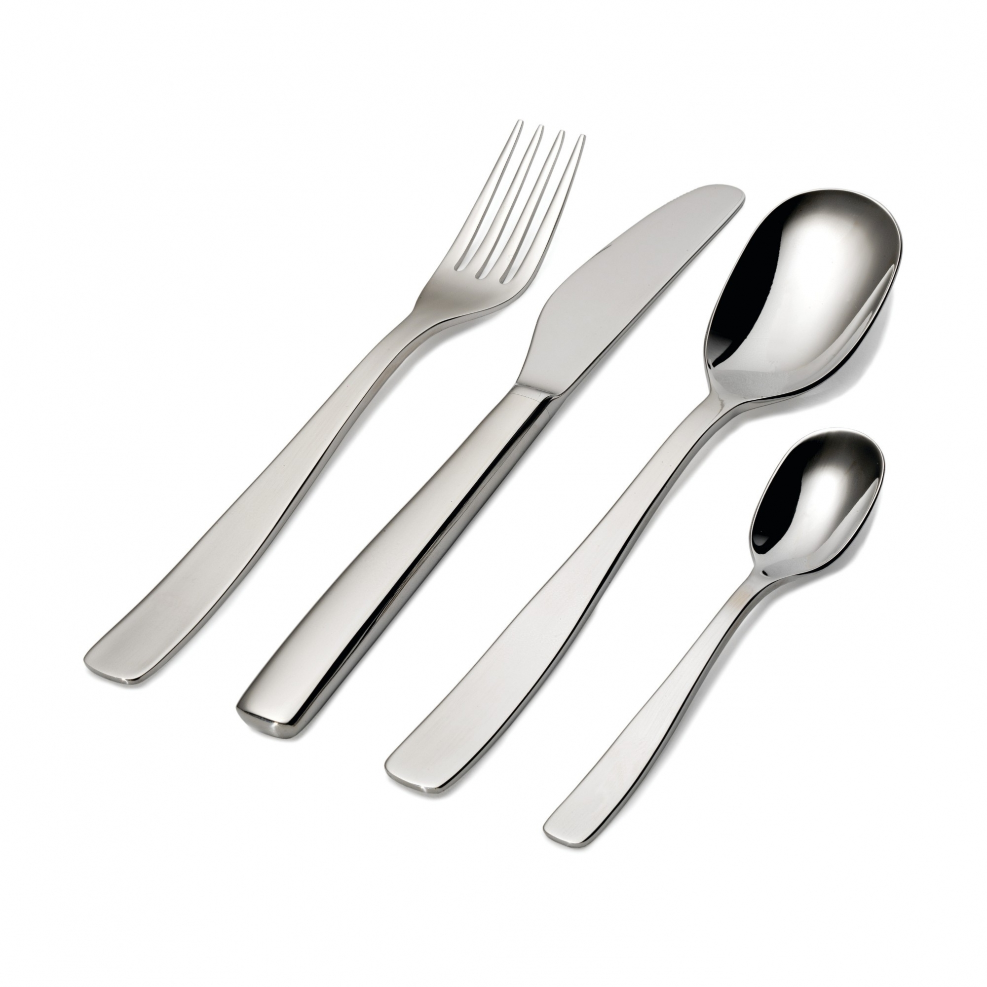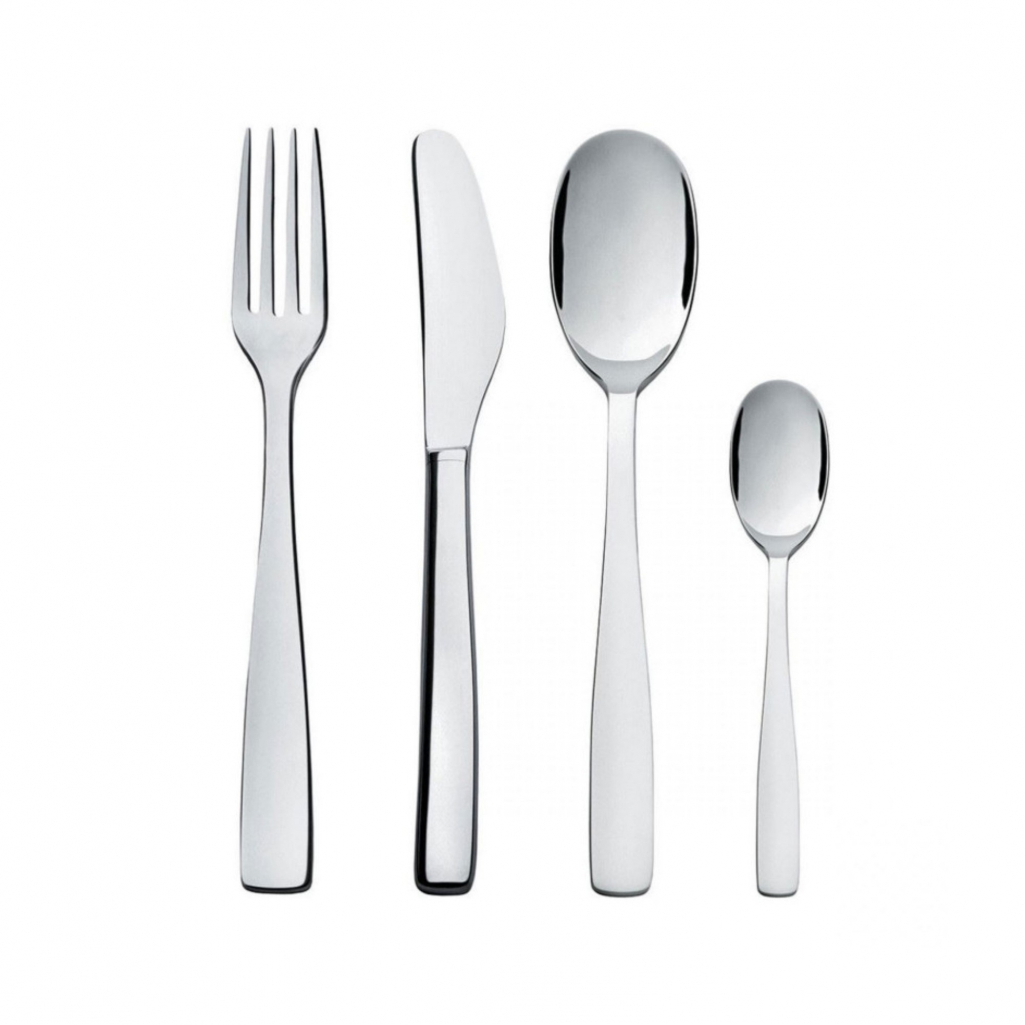 Servizio di 24 posate KnifeForkSpoon in acciaio inossidabile 18/10. Il servizio comprende 6 cucchiai da tavola, 6 forchette da tavola, 6 coltelli da tavola e 6 cucchiaini da caffè. Queste posate fanno parte del progetto "KnifeForkSpoon" ideato dal designer Jasper Morrison, progetto che si fonda sul tentativo di riduzione alla natura generale dell'oggetto "posata" nella sua forma più pura e concreta senza rilevanze di stile e senza particolarismi, quindi ben riconoscibile nell'opera del nostro autore.