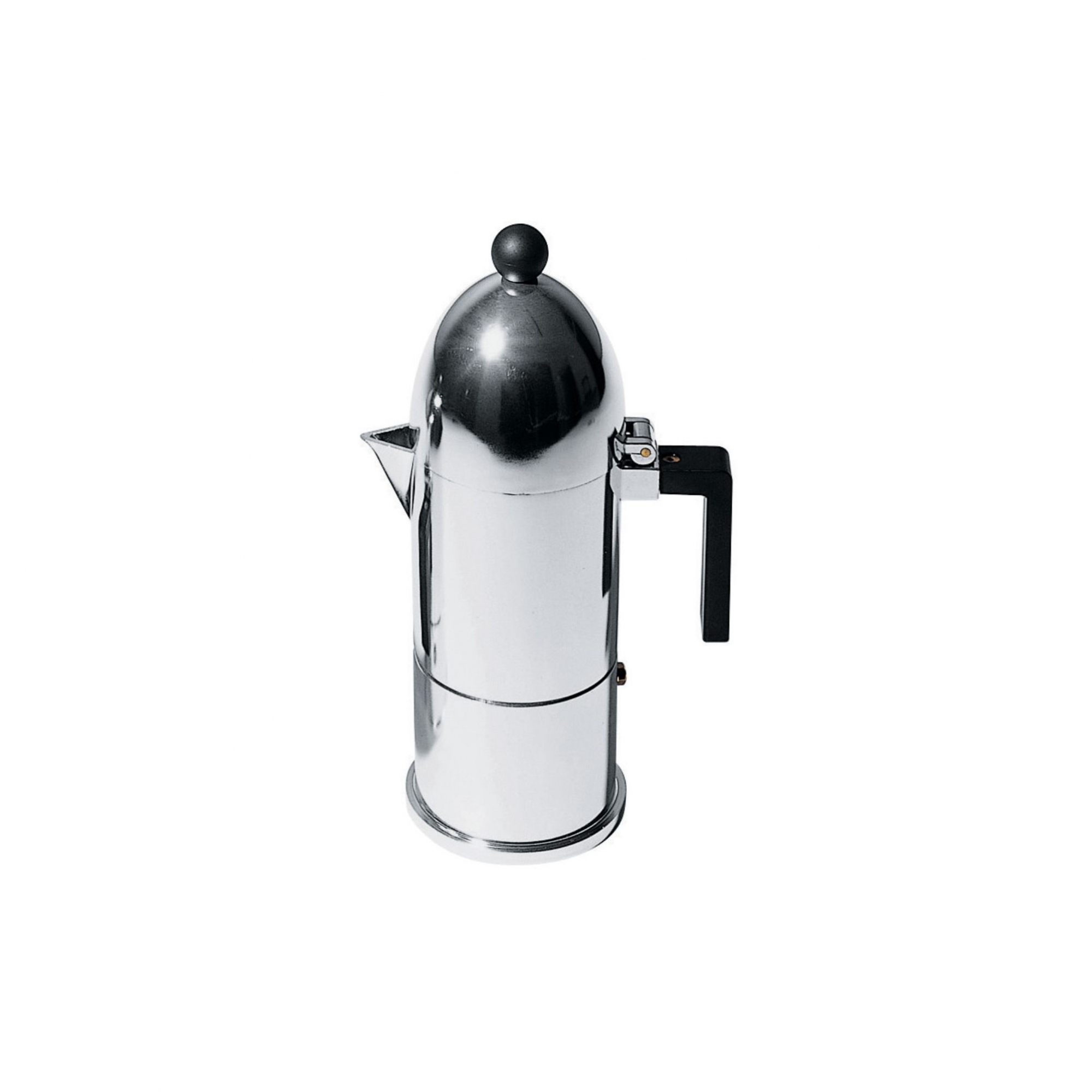 La Cupola coffee maker made of aluminium with handle and knob in black thermoplastic resin, 3 cups. With a simple and compact design, this object is able to satisfy different taste type because of the high-quality material and its extreme functionality. Fast in making, low quantity, perfumes and unmissable taste of coffee. Designed by Aldo Rossi for Alessi.