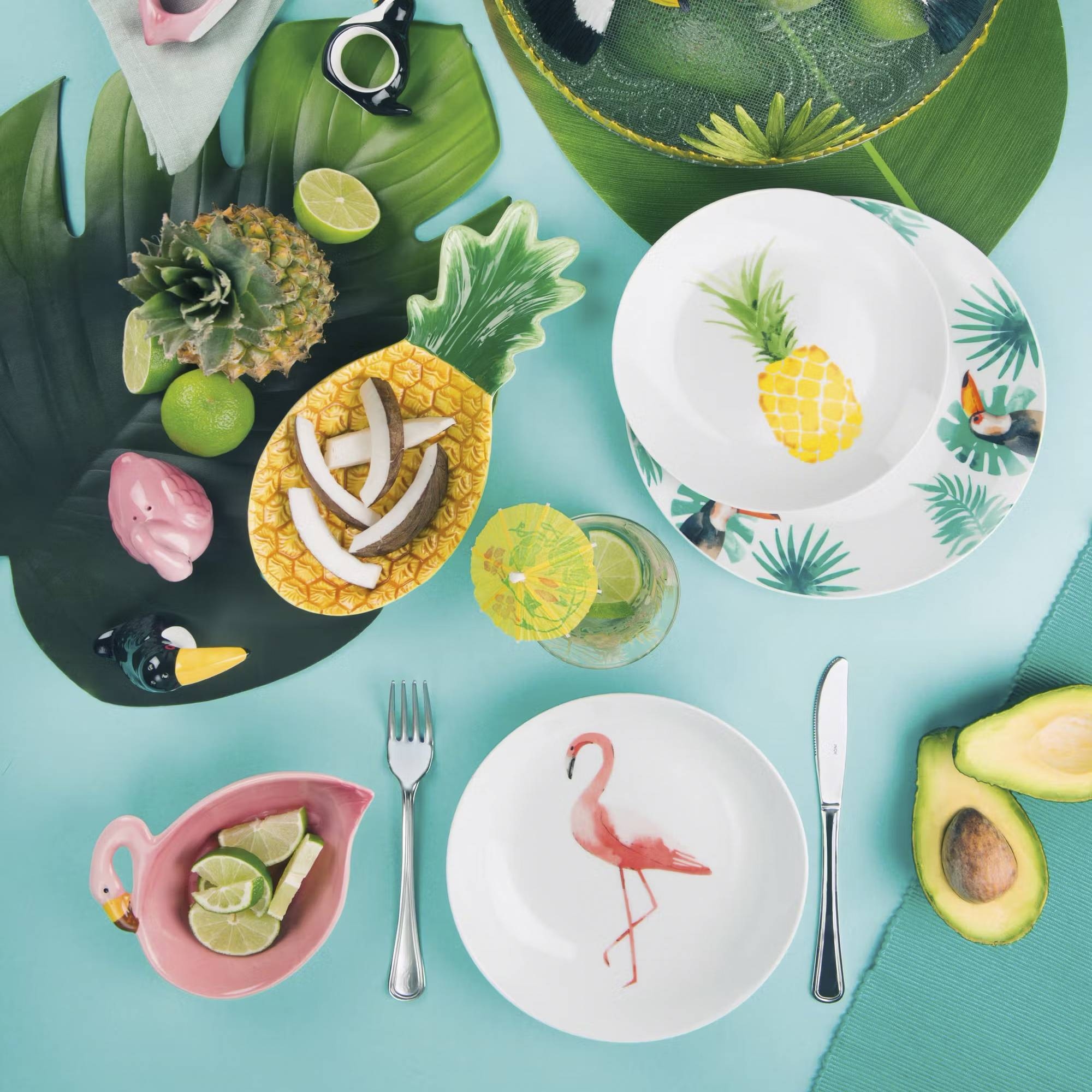 18 Tropical Chic porcelain and stoneware plates with full decal decorations, made by Excelsa.