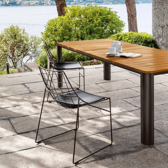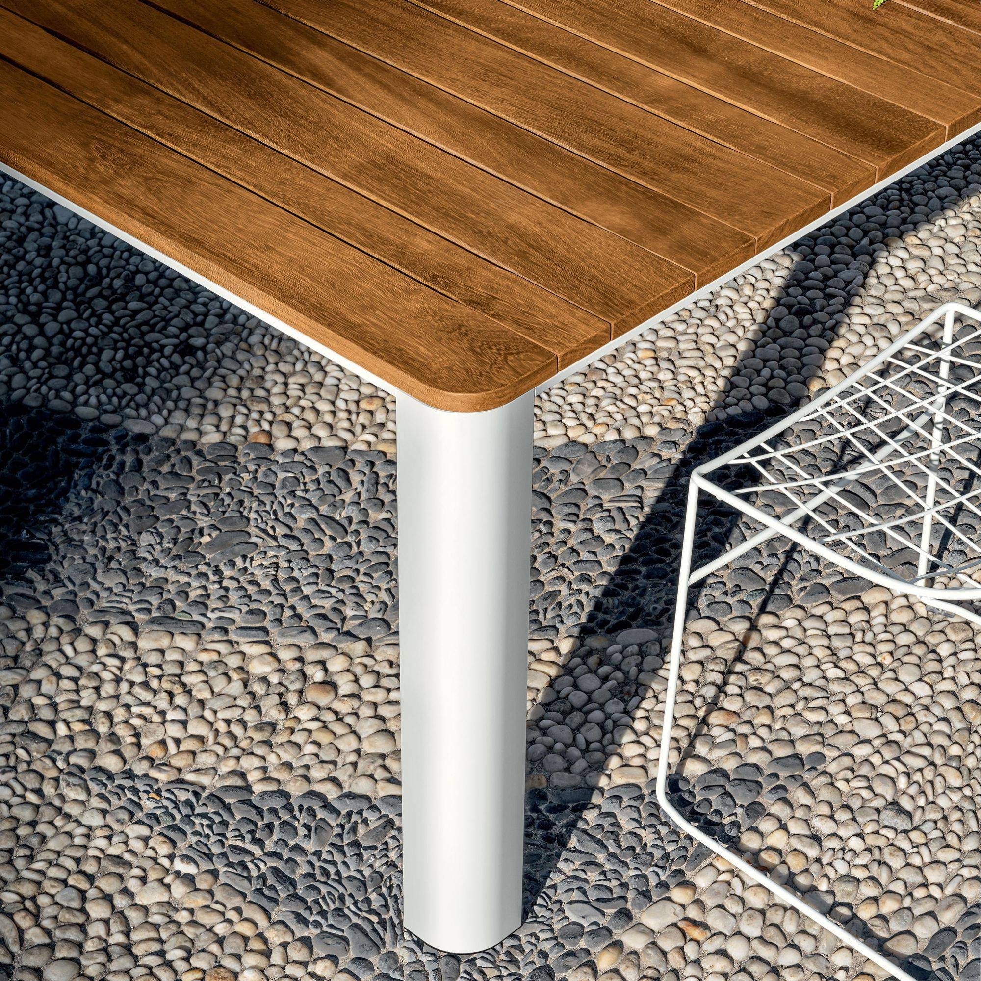 The Kodo Doghe outdoor table, crafted with an embossed metal base and an Iroko wood top, is available in various finishes. It features a modern and sophisticated design that melds the durability of wood with the lightness of aluminum. The top is made of Iroko wood, an African-origin wood sourced from Chlorophora Excelsa and Chlorophora Regia plants. The legs and structure are made of painted aluminum, available in a range of colors. The Kodo Outdoor Doghe table by Sovet is a versatile and functional piece, suitable for various outdoor settings such as gardens, terraces, or patios. Designed by Studio Sovet.