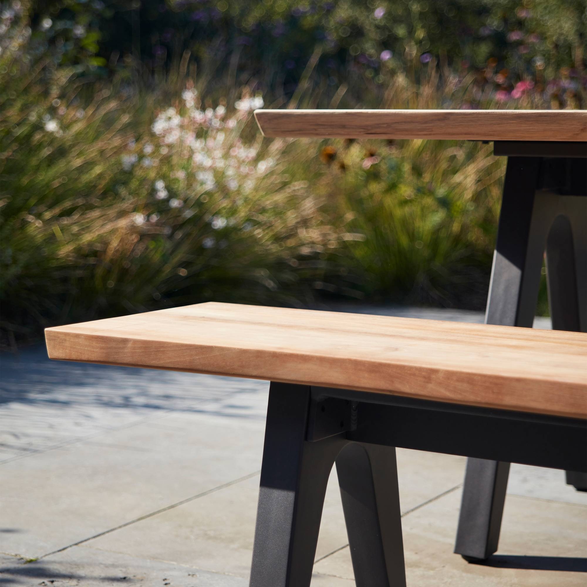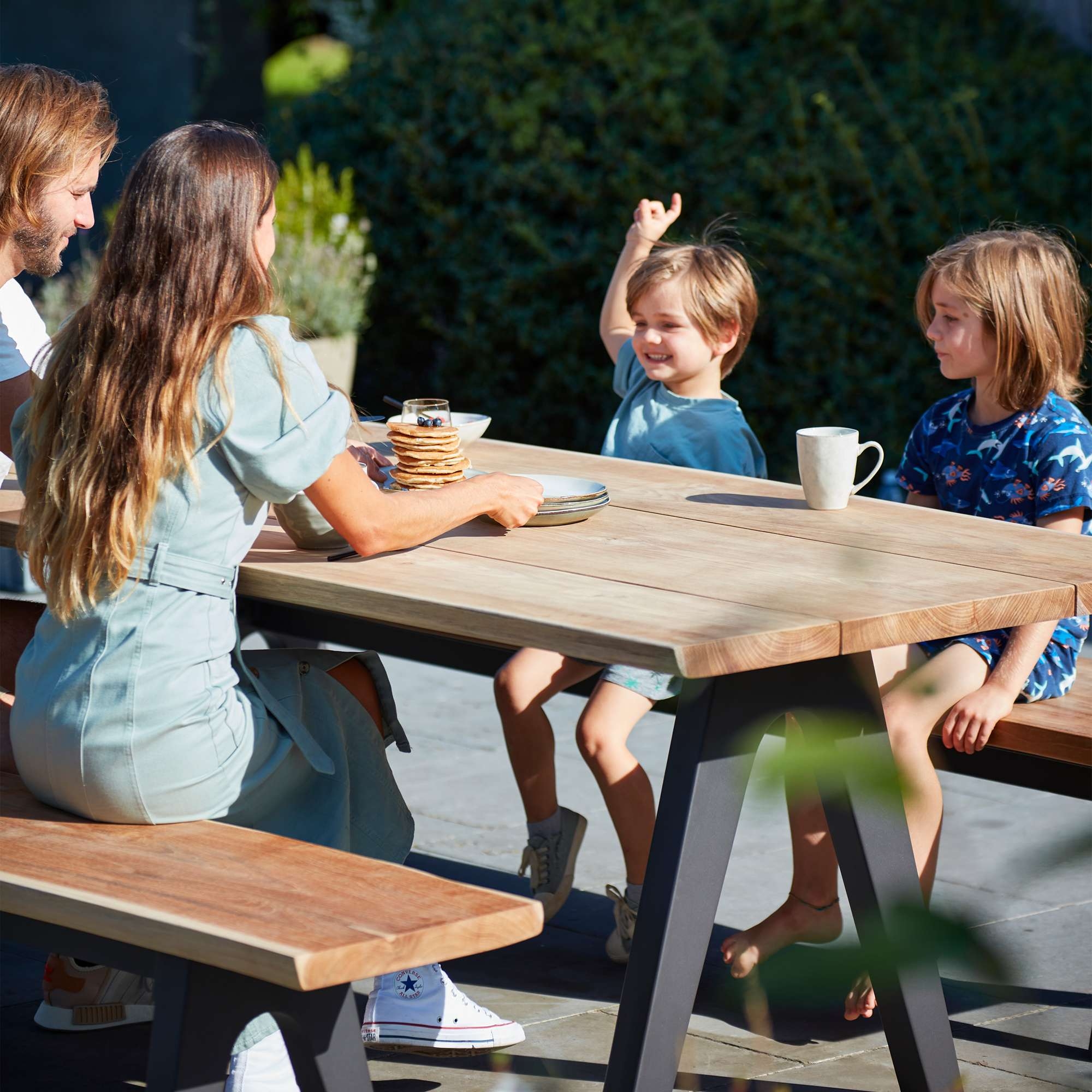 The Pure dining table and bench, measuring 280x100 cm and 280x40 cm respectively, are two exquisite pieces created by Diphano for the Pure collection using the highest quality aluminum, promising robustness and durability, along with precious Teak wood ensuring resistance to various weather conditions such as UV rays, humidity, and rain, making it perfect for placement on a veranda or in a garden. This outdoor pair is a unique and versatile item, perfectly matching both rustic and modern styles: whether it's a garden or a patio with completely different decors, the Pure dining table and bench add a touch of naturalness and warmth to any home space. Thanks to its generous dimensions, it accommodates a lot of people, making it ideal for family lunches or dinners, or for outdoor parties with friends. Moreover, the bench, running along the side of the table, offers informal and convivial seating, fostering sharing and socialization. The tops of the bench and table are entirely treated with Diphano Teak Stain Protector, an invisible timber impregnator that makes it water and dirt repellent while maintaining its beautiful Teak color over time. Don't miss the opportunity to have these two jewels in your garden.