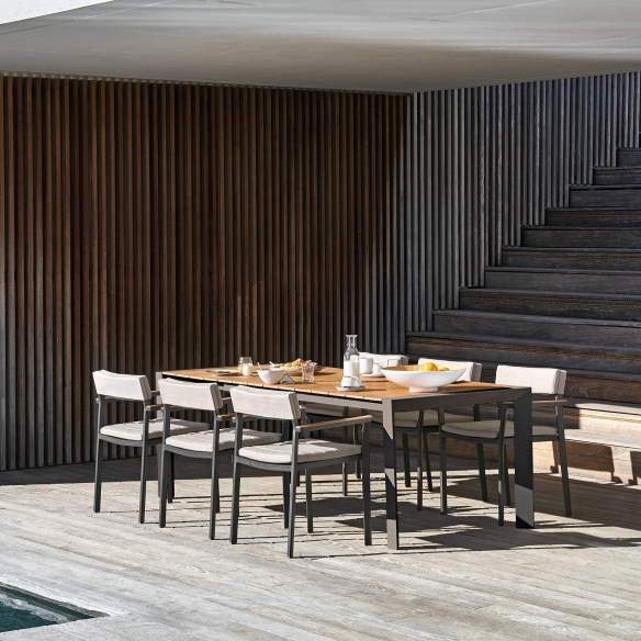 ?The Alexa extendable table, sized 160-220x96 cm with a height of 75 cm, has been made with high-quality materials, typical of Diphano, such as sturdy aluminum that endures over time, and the highly esteemed Teak wood ensuring resistance to various weather conditions including rain, UV rays, and humidity. This magnificent outdoor table is available in two beautiful colors, making it a match for any type of outdoor furniture: it can be placed on a minimalist-style terrace, or in a garden next to a modern, cutting-edge swimming pool. A special feature of the Alexa table is its effortless transformation: with minimal effort, this dining table for six people can expand to accommodate eight, thus extending from 160 cm to 220 cm. The ease of maintenance is another strong point of the Alexa extendable table; a simple cleaning with neutral detergent and water is sufficient to preserve its beautiful aesthetic appearance over time. If you are looking for an extendable table that combines beauty, functionality, and innovation, the Alexa extendable table is perfect for you.