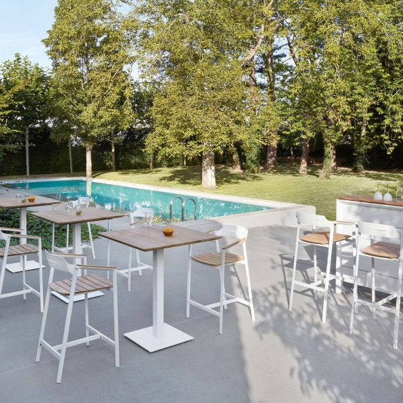 The high Bistro table Alexa, measuring 75x70 cm with a height of 108 cm, is meticulously crafted by Diphano, using materials such as durable and lightweight aluminum, and the esteemed Teak wood that guarantees resistance to various weather conditions. The tabletop is made from Trespa: a high-pressure laminate, hygienic and easy to clean. The high Bistro table is available in four beautiful colors, matching any type of environment and furnishing style. Moreover, it is a non-bulky yet functional table, as it provides a stable and secure surface for plates, glasses, and various items, while its slender profile does not obstruct the view and allows for optimal utilization of the surrounding space, making it perfect for areas with limited capacity. Additionally, the feet of this wonderful Bistro table are adjustable, thus making the table easy to level. The design of this outdoor Bistro table is linear and minimalist, and the height of the table caters to the needs of outdoor spaces looking to create a more informal and convivial atmosphere. Choose the high Bistro table Alexa, 75x70 h108, and you will love this mix of functionality, innovation, and elegance in your home.