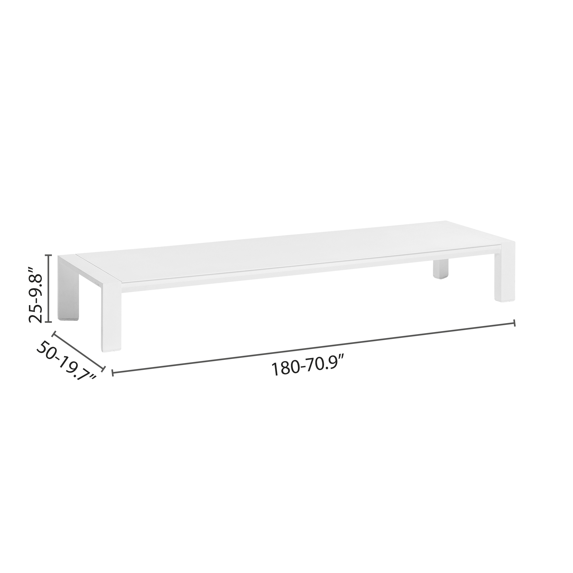 The Metris coffee table, measuring 180x50 cm and with a height of 25 cm, is an exquisite work of art created by Diphano for the Metris collection, entirely made of the highest quality powder-coated aluminum, promising robustness and resistance to various atmospheric agents such as UV rays, rain, and humidity, making it perfect for outdoor use. Available in two beautiful combinations, the Metris coffee table harmonizes seamlessly in environments with various styles and decors, whether chosen for a modern garden, an urban balcony, or a more classic spacious terrace. The 180 cm surface ensures space for any item: books, cups, glasses, outdoor decorations, or even plants. The slats of the Metris table are made of aluminum, facilitating maintenance and cleaning. The Metris coffee table 180x50 cm is more than just a simple piece of furniture; it is a true statement of style, functionality, and unparalleled innovation.