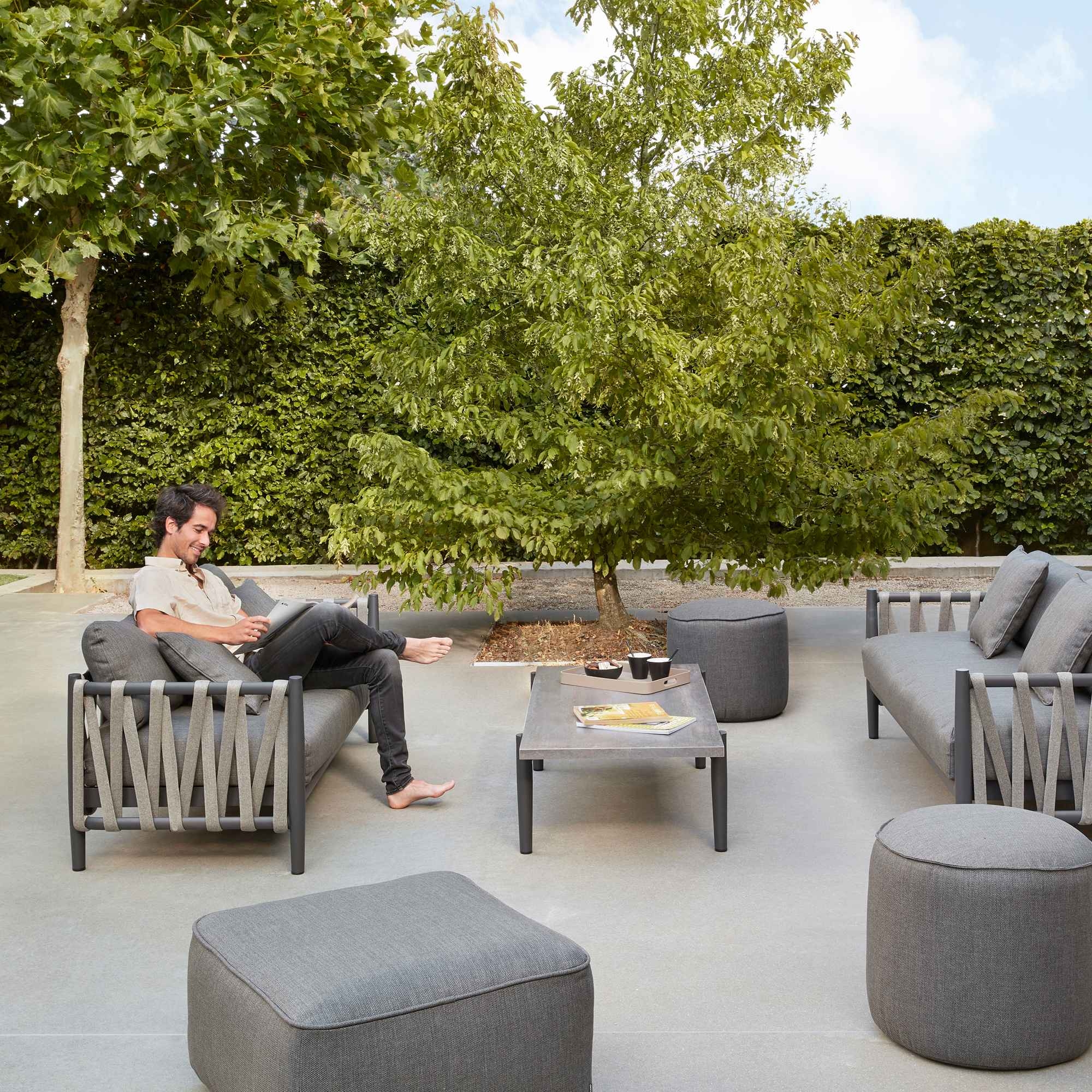 The Switch Rope coffee table, with a ceramic top, 140x62 cm and a height of 36.5 cm, is a jewel in the Diphano collection made from high-quality aluminum that promises sturdiness and resistance to various weather elements such as rain, UV rays, and humidity. Its ceramic top ensures easy maintenance and adds a touch of luxury to the surrounding environment. This outdoor coffee table is a unique piece that, with its length of 140 cm, offers ample space to accommodate drinks, books, and various decorations: the Switch Rope coffee table with a ceramic top is perfect for private events with friends and family or for moments of relaxation alone. Moreover, the design and clean lines of this outdoor table ensure it matches any type of decor and setting, whether it be a rustic and natural garden or a spacious classic and traditional terrace. The Switch Rope coffee table with a ceramic top has been conceived and designed for seamless integration into outdoor spaces, offering a useful surface that is at the same time aesthetically delicate and refined. This table will become a must-have for those seeking a piece of furniture that is functional, innovative, and luxurious.