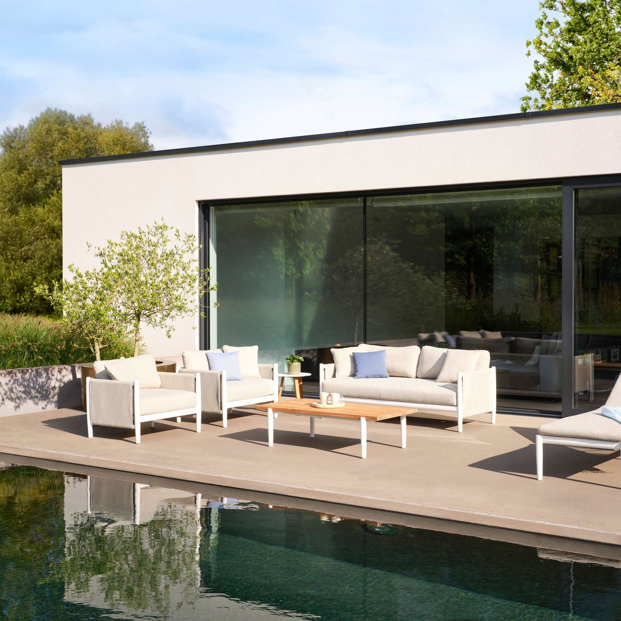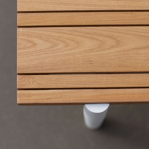 The Switch Fabric coffee table, with a Teak top, measuring 140x62 cm and standing at a height of 37 cm, is a jewel from Diphano's collection crafted from high-quality aluminum that promises durability and resistance to various weather conditions such as rain, UV rays, and humidity. The Teak top offers ease of maintenance and adds a touch of natural beauty to the surrounding environment. This outdoor coffee table is a unique piece that, with its length of 140 cm, provides ample space for hosting drinks, books, and various decorations: the Switch Fabric coffee table with a Teak top is perfect for private gatherings with friends and family or for moments of relaxation alone. Moreover, the design and clean lines of this outdoor coffee table ensure that it complements any type of decor and setting, whether it be a rustic and natural garden or a spacious, classic, and traditional terrace. The Switch Fabric coffee table with a Teak top has been designed and crafted for seamless integration into outdoor spaces, offering a useful surface while being aesthetically delicate and refined. This coffee table will become a must-have for those seeking a piece of furniture that is functional, innovative, and luxurious.