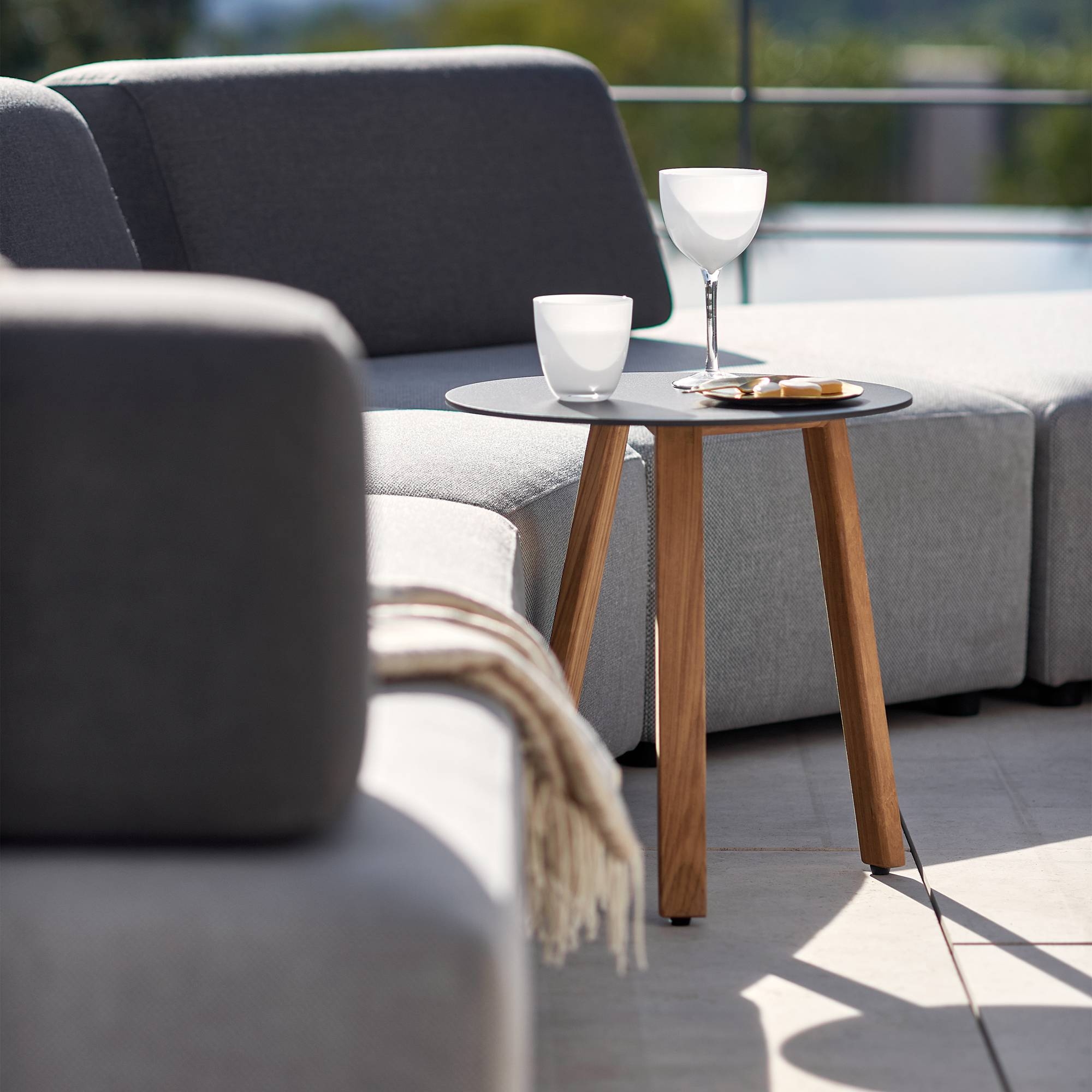 The Elite Easy Fit side table, with a diameter of 42 cm and a height of 44 cm, is a true masterpiece made of high-quality aluminum promising durability and resistance to various climatic changes such as UV rays and moisture. It features a Trespa top for easy cleaning, and precious Teak wood that adds a touch of naturalness and luxury to the surrounding environment. Moreover, the Elite Easy Fit side table is available in eight wonderful combinations, adding versatility to the product, making it suitable for any type of space and decor style: it can be placed inside a spacious classical style terrace, or in a modern garden with a pool. The Easy Fit series by Diphano is famous for its ease of assembly, making this table an ideal choice for those looking for beautiful yet uncomplicated options. The outdoor side table, with its diameter of 42 cm, provides a stable support for drinks, books, or various mobile devices. The Elite Easy Fit side table is the perfect blend of style, innovation, and functionality; it will become a must-have for all design lovers.