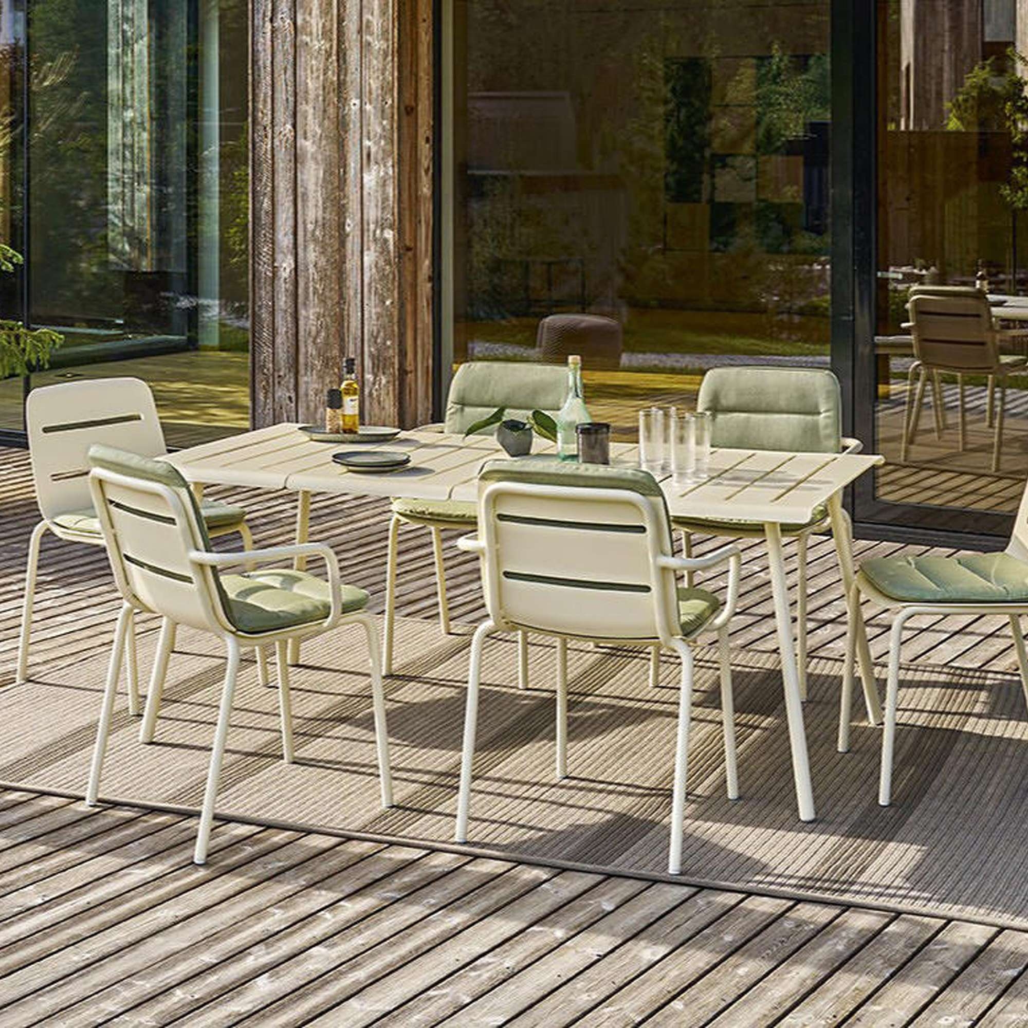 The Vapio outdoor table, measuring 180x90x74h cm and crafted from powder-coated aluminum, is a testament to an impeccable blend of innovation, design, and functionality, designed to enrich any outdoor setting with a distinctive touch of elegance. Available in 10 colors, this outdoor table embodies top-notch material selection, standing out with its sturdy and long-lasting structure. The powder-coated aluminum surface not only gives the table a sleek and modern appearance but also ensures protection against the elements and easy maintenance, allowing the table to remain in pristine condition season after season. Every Vapio table results from a meticulous design process that considers aesthetic trends as well as environmental impact. The choice of sustainable materials and environmentally-friendly production processes highlights Vapio's commitment to creating high-quality products that respect the planet. Designed by This Weber for Weishäupl, choosing the Vapio outdoor table means opting for furniture that perfectly balances beauty, innovation, and environmental responsibility. Bring contemporary design and functionality to your outdoor space with Vapio, and transform every moment into an unforgettable experience.