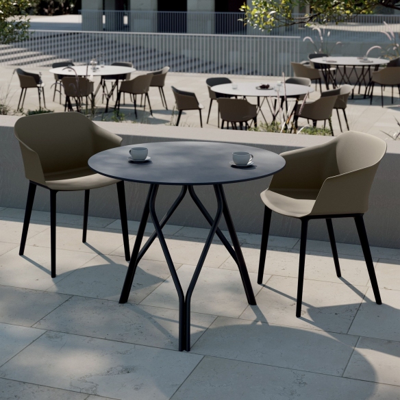 The Mimì round table is a perfect accessory for moments of outdoor relaxation, crafted with a base entirely made of aluminum and a top in ceramic or HPL, top-tier materials that ensure resistance to ultraviolet rays and moisture, longevity, and versatility. This beautiful outdoor round table boasts a minimalist design and is available in six wonderful colors, thus capable of adapting to any setting and style of décor, from a vintage terrace to an ultra-modern garden. Mimì is a round table designed for sharing moments. The stackable base, fully recyclable aluminum, is made from a cross of tubes that create a vortex of filled and void spaces through which light filters, lightening the perception of bulk. Choosing the Mimì round table from My Your means investing in a piece of design that combines innovation, durability, and refinement, offering a unique touch of luxury to environments intended for conviviality and sharing.