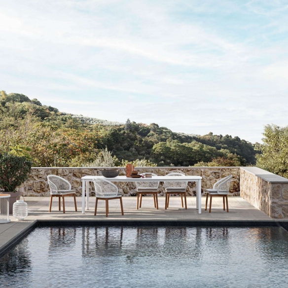 Dulton outdoor rectangular table 212x112x78h cm made with white aluminum and graphite structure with HPL or stoneware top, available in two colours. Ideal for both residential and commercial settings, the Dulton table elegantly adapts to terraces, gardens, balconies and spaces dedicated to hospitality, such as outdoor cafes and restaurants. Made with particular attention to design and durability, this table features a sturdy aluminum structure, available in white or graphite finishes, which guarantees resistance to atmospheric agents and a long useful life. The table top, chosen between high-resistance HPL or quality porcelain stoneware, is offered in two different colors to adapt perfectly to any style of external decoration. The format of the Dulton table allows you to optimize the available space, making it particularly suitable for convivial meetings, outdoor dinners or as a meeting point in any outdoor context. Its clean and essential line reflects the current trend in outdoor furnishings, favoring elements that combine minimal aesthetics with maximum functionality. Designed by Atmosphera Creative Lab.