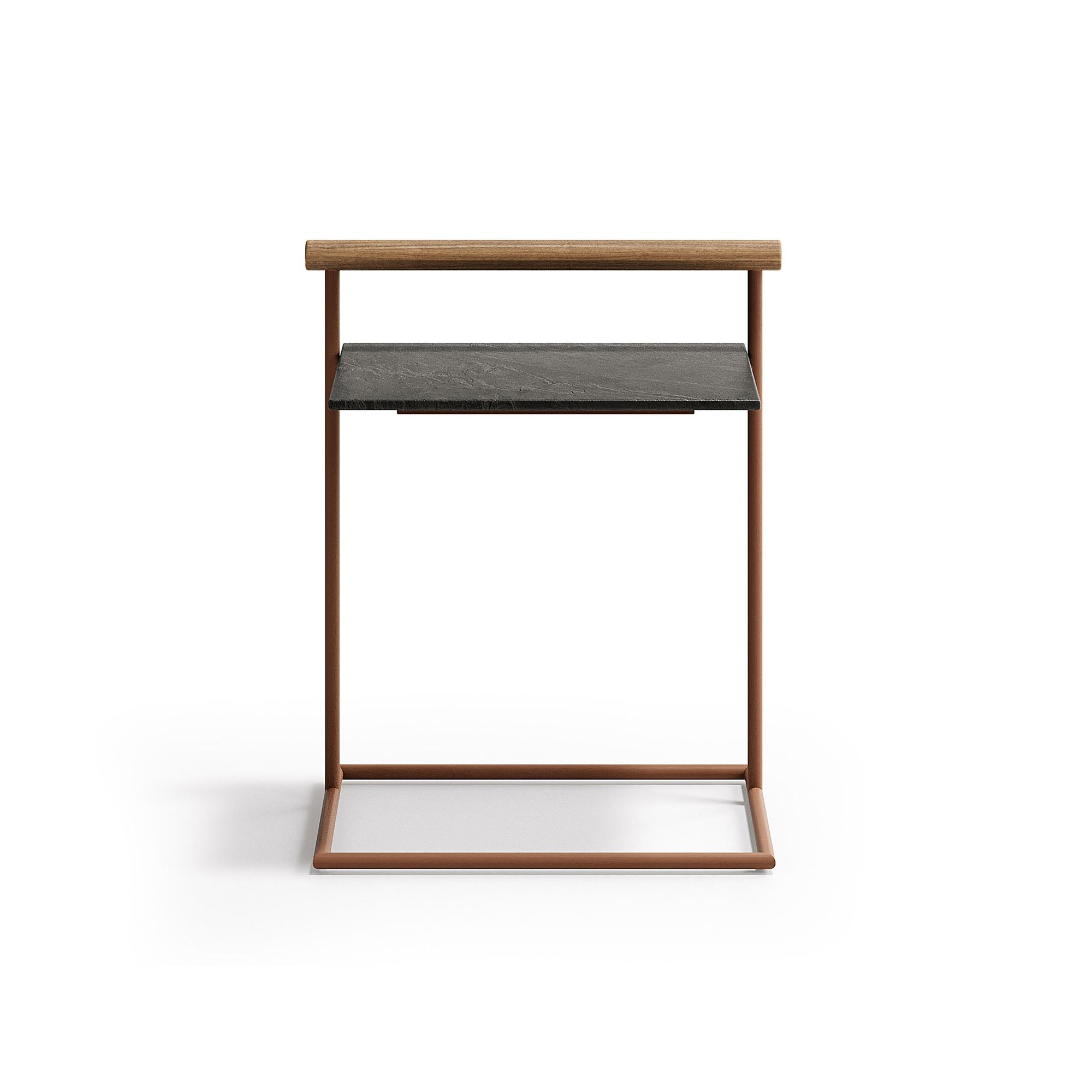 The Pipe outdoor service table, sized at 62.5x40x72.5h cm, is crafted with a terracotta-painted steel structure, teak details, and a Noir Beige stoneware top. Its compact size and ingenious functionality make it perfect alongside sofas, armchairs, or chaise longues, offering a useful and easily accessible resting surface. Easy to clean and resistant to weather elements, the Pipe service table is the ideal companion for worry-free outdoor enjoyment. This table is not just a piece of furniture but a practical solution that meets the needs of those who love living in outdoor spaces. Whether used to hold refreshing drinks, house your favorite book during a relaxing afternoon, or serve as a support for candles and soft lights during outdoor evenings, the Pipe service table enhances every moment of outdoor living. Include the Pipe outdoor service table in your outdoor living setup and discover the pleasure of hosting, celebrating, and relaxing in an unmistakable style. Designed by Busetti Garuti Redaelli, this piece fits perfectly within Atmosphera's vision for uncompromised quality or elegance in outdoor design. Designed by Busetti Garuti Redaelli for Atmosphera.