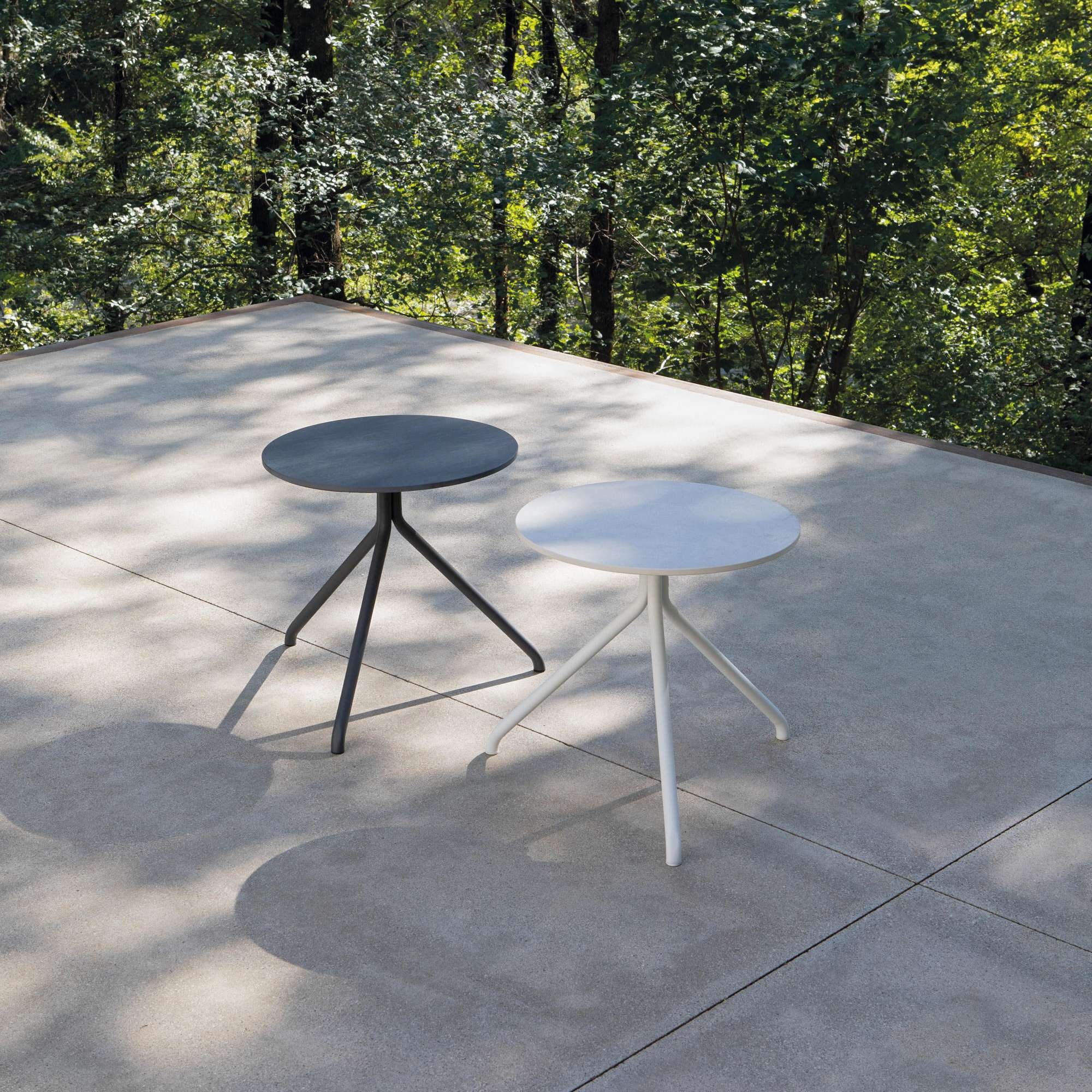 The Trio outdoor service table, Ø50x50.5h cm, crafted with an aluminum frame and a porcelain stoneware top, is available in 3 colors. It stands out for its minimalist and essential aesthetics, which combine sturdiness and versatility into a single design, allowing it to perfectly integrate into any outdoor setting. The robust structure of the table, available in white, graphite, or terracotta aluminum, alongside the porcelain stoneware top, creates a material contrast that gives the Trio model a strong and recognisable identity, while being incredibly versatile and adaptable to various furnishing styles. This outdoor table is ideal for those looking for a functional and elegant design piece, capable of enriching terraces, gardens, and outdoor spaces, adding a touch of contemporary style and practicality. Its multifaceted character makes it suitable for different uses: from a simple surface for drinks and snacks to becoming the focus of convivial moments outdoors. Choosing the Trio outdoor service table means opting for quality outdoor furniture, which combines beauty, durability, and functionality, suitable for those who wish to enhance their open spaces with a distinctive design touch. Designed by Atmosphera Creative Lab.