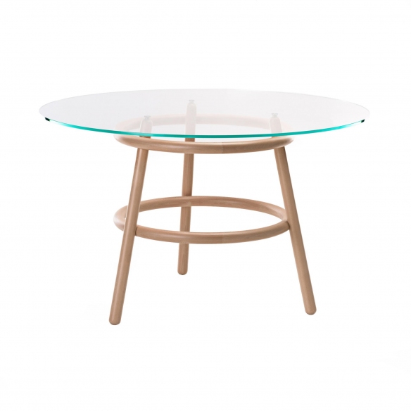 Magistretti 03 02 table with structure made of solid beech wood and characterized by the intersection of three legs with two circles and a tempered glass top with an extra-clear transparent polished edge and perfect for creating a unique and personal style in a home dining area or in the restaurant business. Designed by Vico Magistretti for Wiener GTV Design.
