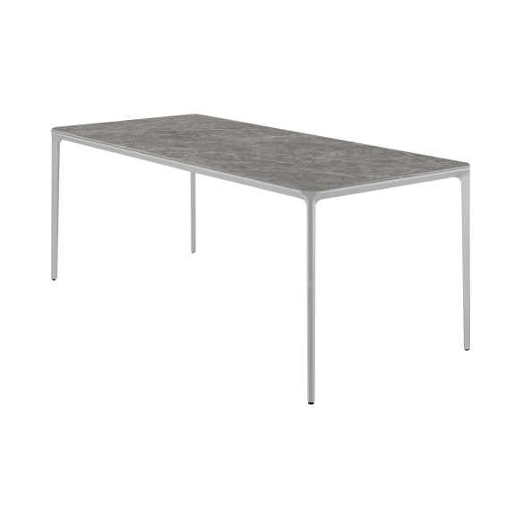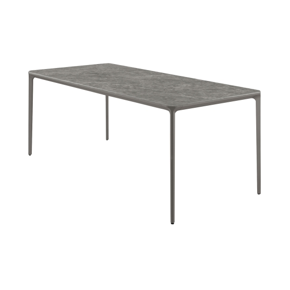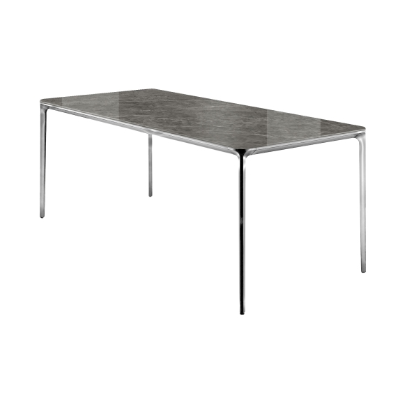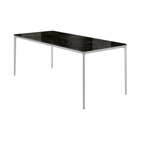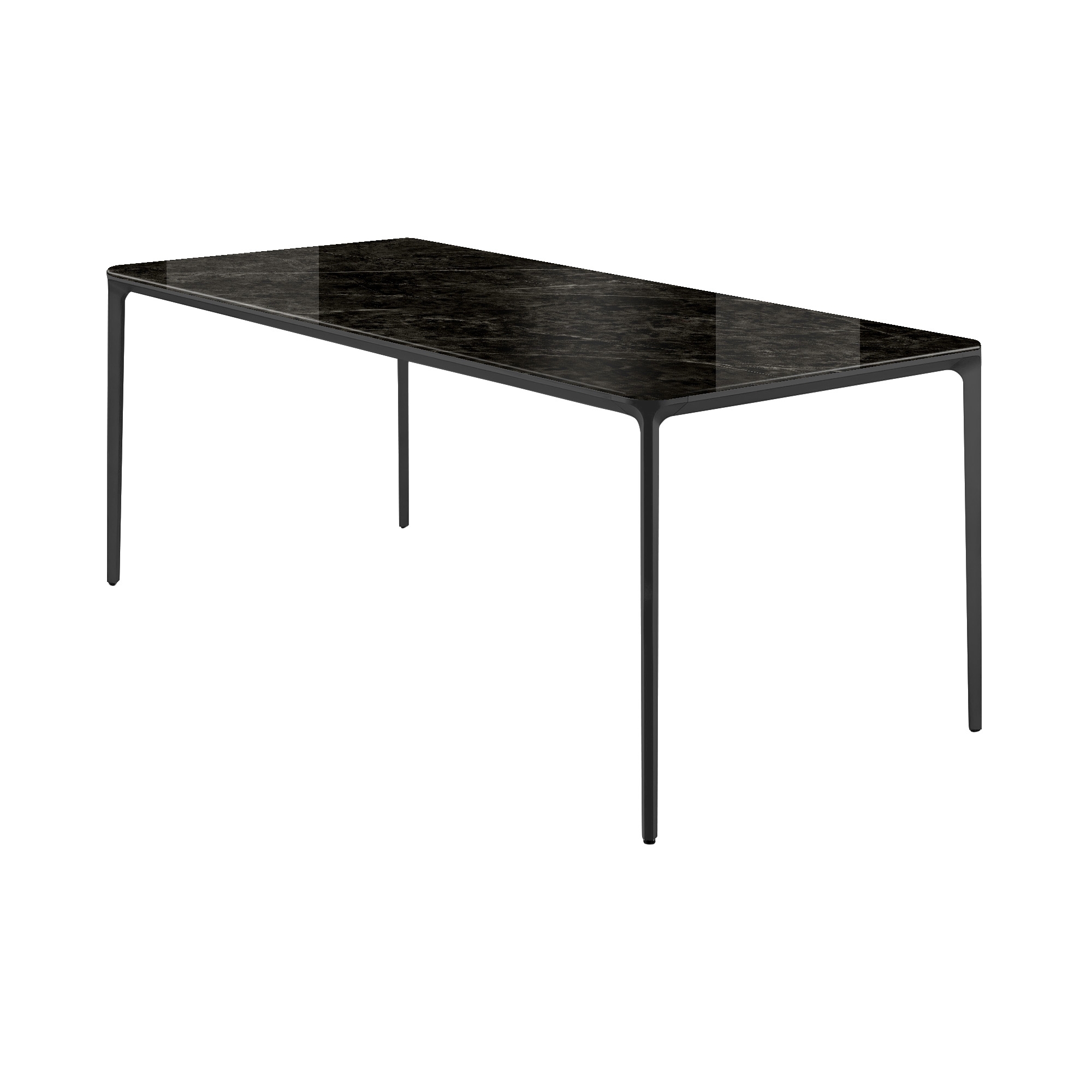 Slim rectangular table made with aluminum legs and structure, ceramic top. Elegant and refined, the Slim rectangular table is able to harmonize with any environment, from the kitchen to the living room, from the minimalist to the contemporary style. The base of the Slim table is made of aluminium, a material known for its resistance and lightness, which goes perfectly with the contemporary character of the piece. The slender and sinuous legs combine perfectly with the ceramic of the top, which with its refined and smooth to the touch finish, gives the slim table an elegant and resistant look. Designed by Matthias Demacker for Sovet.