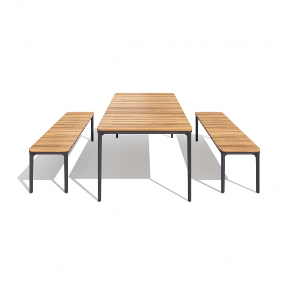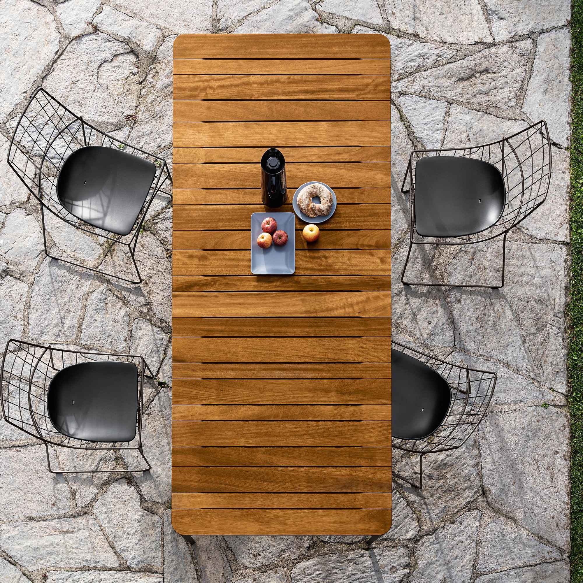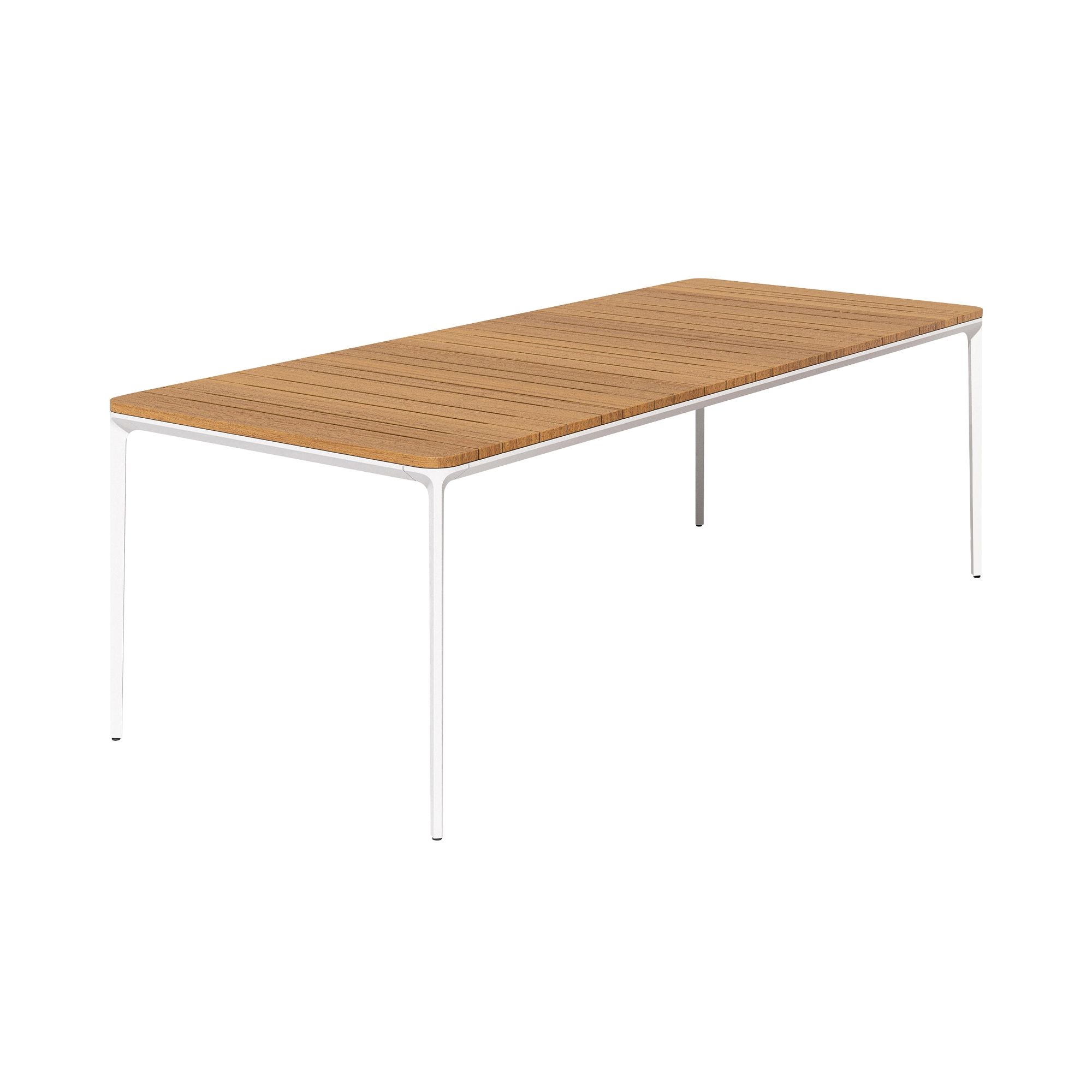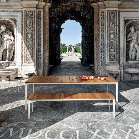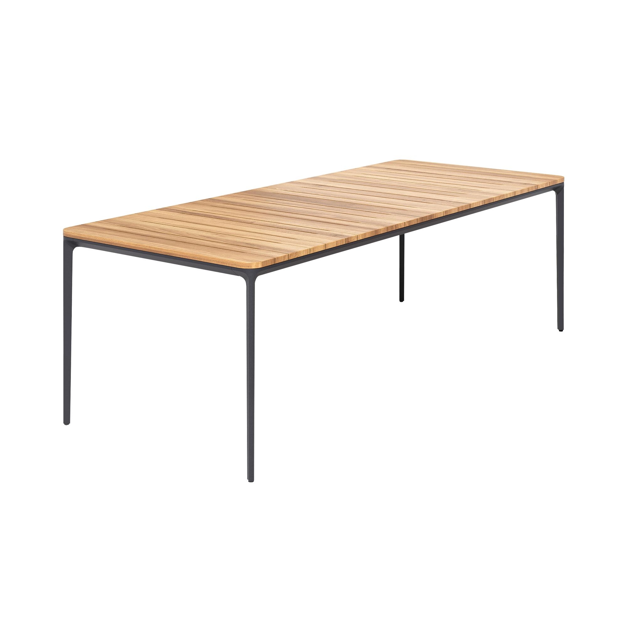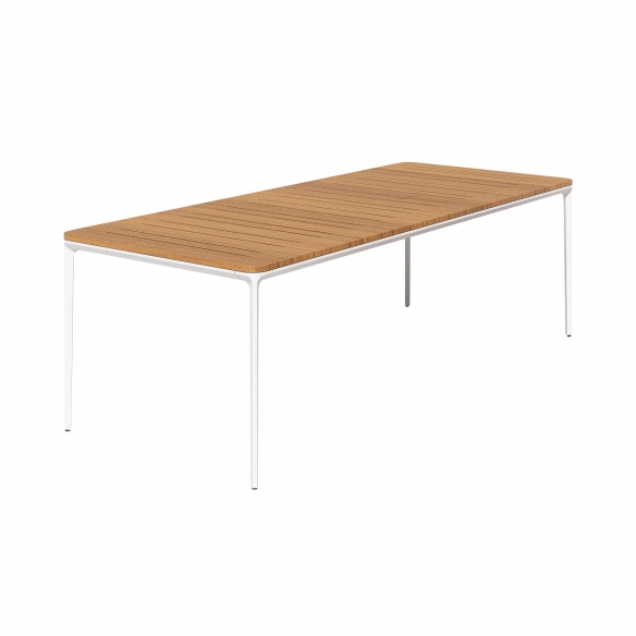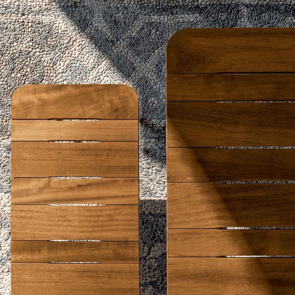 Slim Doghe rectangular table made with aluminum legs and structure, top in Iroko slats. Available in 8 sizes, the Slim Doghe table by Sovet adapts to every space and style requirement. Whether you want to furnish a cozy living room or an elegant dining room, this table adapts perfectly to the context, offering an unparalleled aesthetic and functional experience. The table top is made of Iroko slats, a precious wood that exudes warmth and natural beauty. Iroko is known for its resistance to wear and bending, ensuring a durable and easy to clean surface. Each Iroko stave is unique, with veins and shades that give the Slim table a distinctive personality and timeless charm. Designed by Matthias Demacker for Sovet.