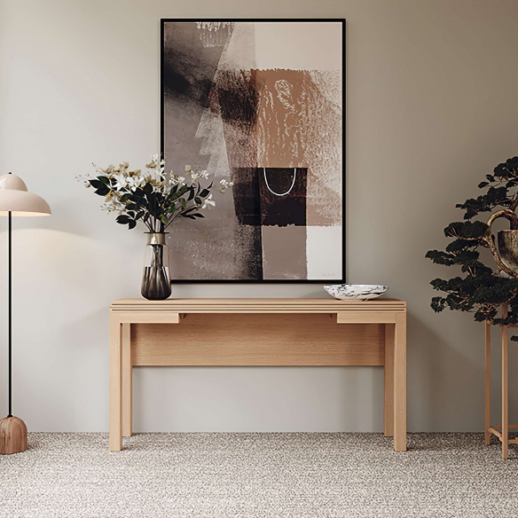 Papillon console table 95x31 cm made with solid wood structure and veneer top, divided into three movable parts. Available in 3 elegant color finishes, Papillon easily transforms from a table to a console with a simple movement of the legs and top, adapting perfectly to every need and space. Papillon demonstrates that evolution is never a slave to the same form. Designed by Bernard Vuarnesson for Sculptures Jeux.
