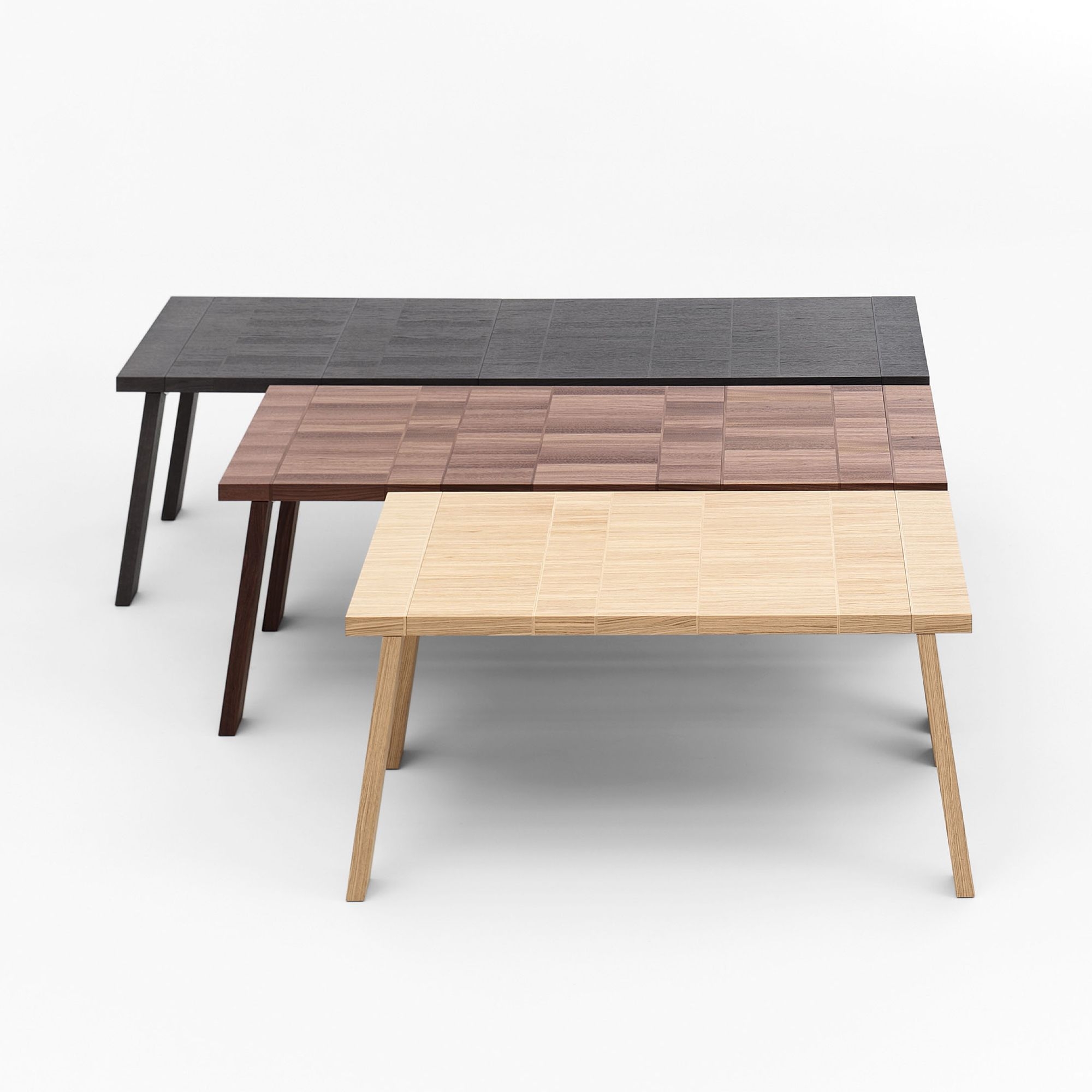 Section extendable table made of solid wood. Available in 3 sizes and 3 color finishes, the Section table has a natural and refined design, which adapts to any space and occasion. The top has an irregular texture that creates an effect of movement, while the legs are very sturdy and resistant. A table that expresses all the beauty, functionality and versatility of wood. Designed by Stefano Bettio for Sculptures Jeux.