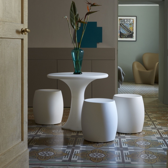 White Teddy table made of sturdy polyethylene (Poleasy). Elegant and compact, the Teddy table is perfect for both indoors and outdoors. It captures attention with its printed embossed finish, offering an innovative and contemporary design. Designed by Moredesign for My Your.
