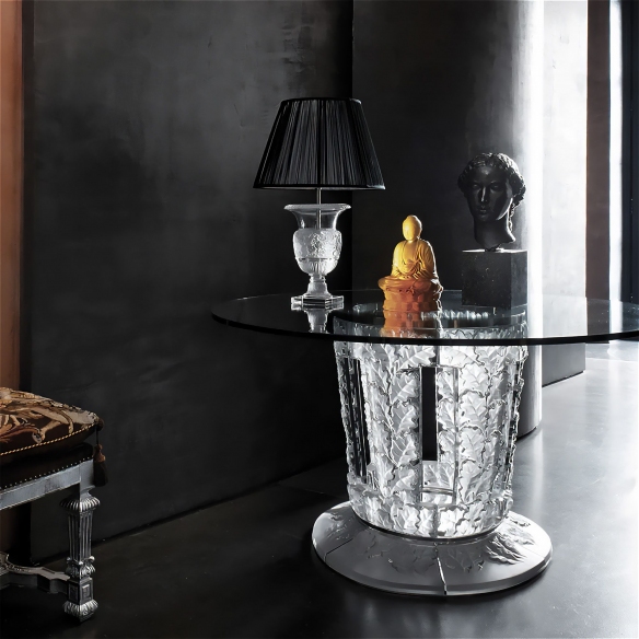 The Chêne round table is an iconic design product created by Marc Lalique, crafted entirely from frosted crystal for the "The Art of Glass" exhibition held in 1951 at the Pavillon Marsan of the Museum of Decorative Arts in Paris. This precious table integrates perfectly into the most creative and contemporary interior design spaces: whether positioned in a living room, in the lobby of a luxurious hotel, or in professional spaces like offices, Chêne adds a touch of elegance and class to any space. Its round shape and the finely carved oak leaves adorning the 6 rectangular panels and the base of the feet celebrate the mastery of Lalique's glassworkers. The luminous effect, enhanced by the reflective properties of the crystal, contributes to creating patterns of light that vary with the changing hours of the day, giving the table an ever-changing and intriguing appearance. The Chêne table by Lalique is the result of a lengthy manufacturing process, during which the crystal is blown, shaped, and ultimately hand-finished by the company's expert artisans. This ensures that each piece is unique and unsurpassable, destined to last over time.