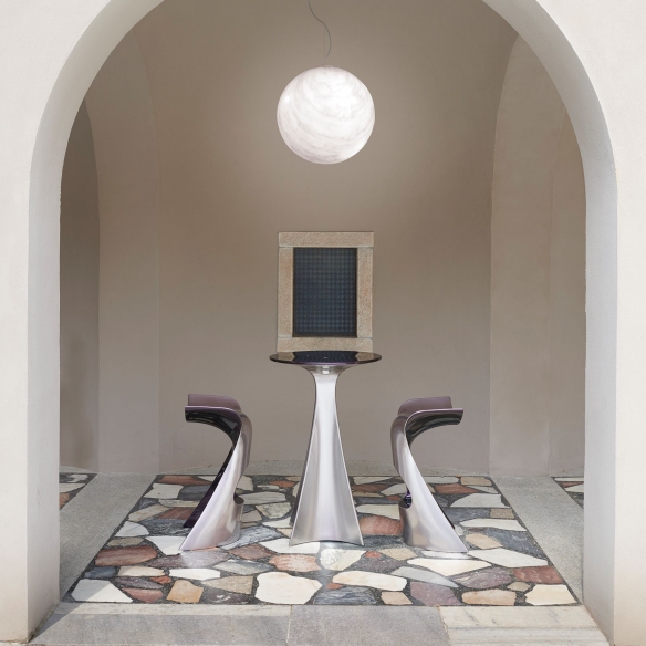 The Jet Next high table, measuring Ø62x100h cm, is a beautiful piece of furniture created entirely by Slide from polyethylene, a material valued for its strength, longevity, and versatility. To celebrate the tenth anniversary of the collaboration between Slide and the designer, a special metallic two-tone lacquered version was created: the silver base merges with the purple top. The Jet table has a curvilinear base that accentuates the silhouette of the stool, and the top is decorated with symbols historically beloved by the designer. This table was designed to occupy space in an optimal and unique way, with its versatile and geometric structure: depending on the user's needs, it can serve as a support surface for drinks, appetizers, or various foods, or as a precious piece of décor. Thanks to its minimalist and futuristic design, the table can blend harmoniously into any type of setting, both indoors and outdoors: from a spacious modern terrace to a classic living room, from a garden with a swimming pool to the dining room, giving brightness and class to any space. The Jet Next table by Slide represents a furnishing solution with a significant visual impact and practicality, capable of transforming any corner, whether inside or outside, into an oasis of style. Designed by Karim Rashid for Slide.