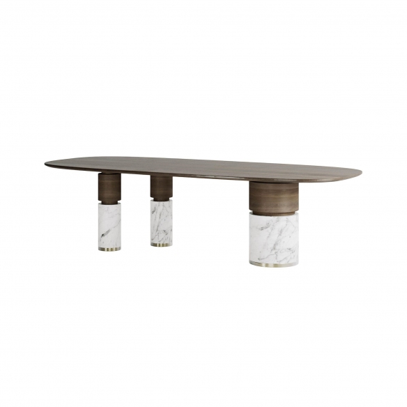 The Loïc oval table is an elegant piece of furniture created by Capital, featuring bimaterial legs characterized by an initial section in lacquered or polished or matte wood, and a second part in marble with metal finish details. These materials endow the table with a timeless elegance and remarkable durability. This table stands out with an elegant and commanding design, and its color palette allows it to be seamlessly integrated into any setting or type of decor: whether placed at the entrance of a home, in a living room, or in a professional studio, Loïc is not just a piece of furniture, but a true object of style that reflects the personality and taste of its owner. Moreover, the table does not only provide ample space to comfortably accommodate up to ten people, but also projects a majestic image of design and craftsmanship. Its spacious center invites conversation and sharing, making it ideal for dinners, family gatherings, or business meetings. Designed by Boatto Martino Studio.