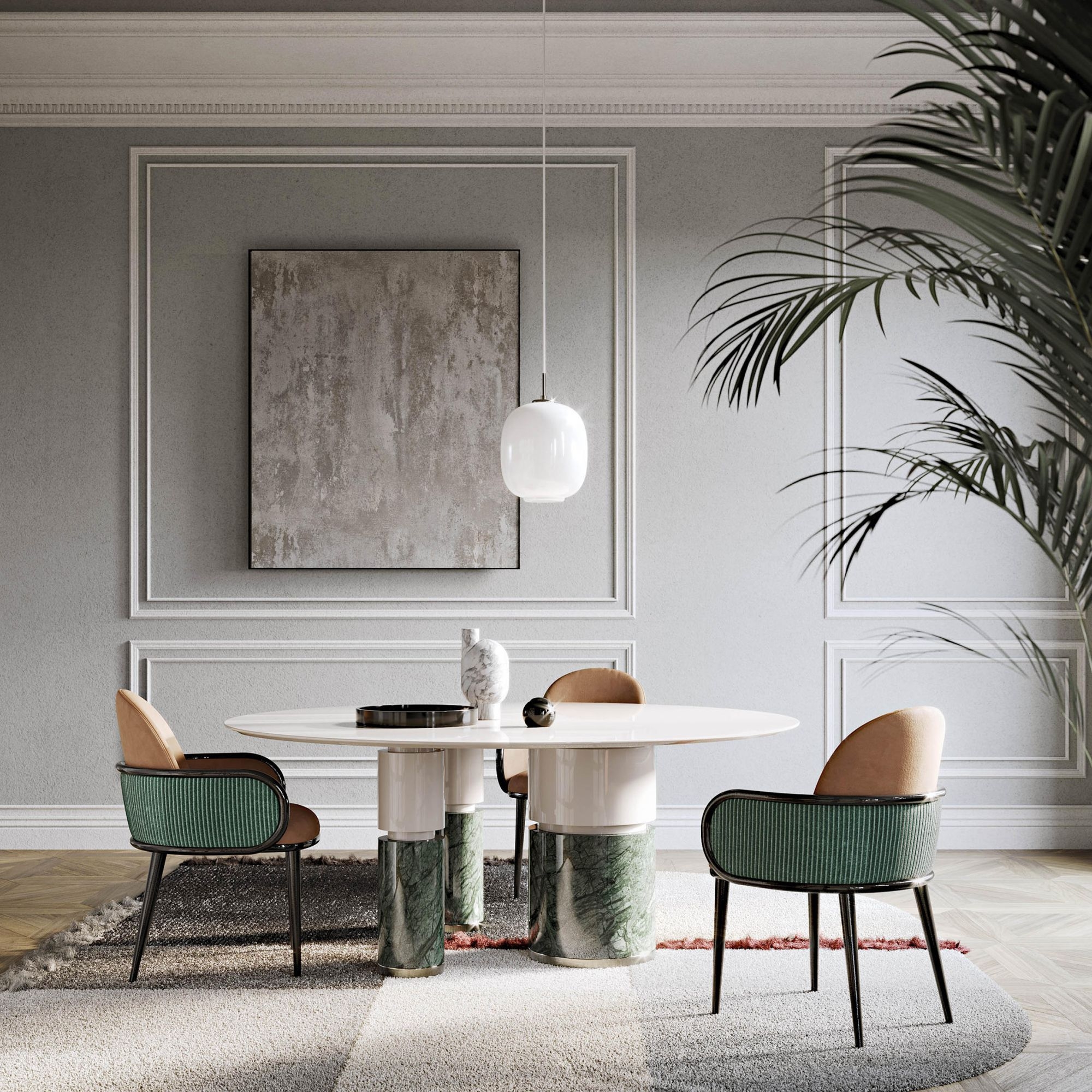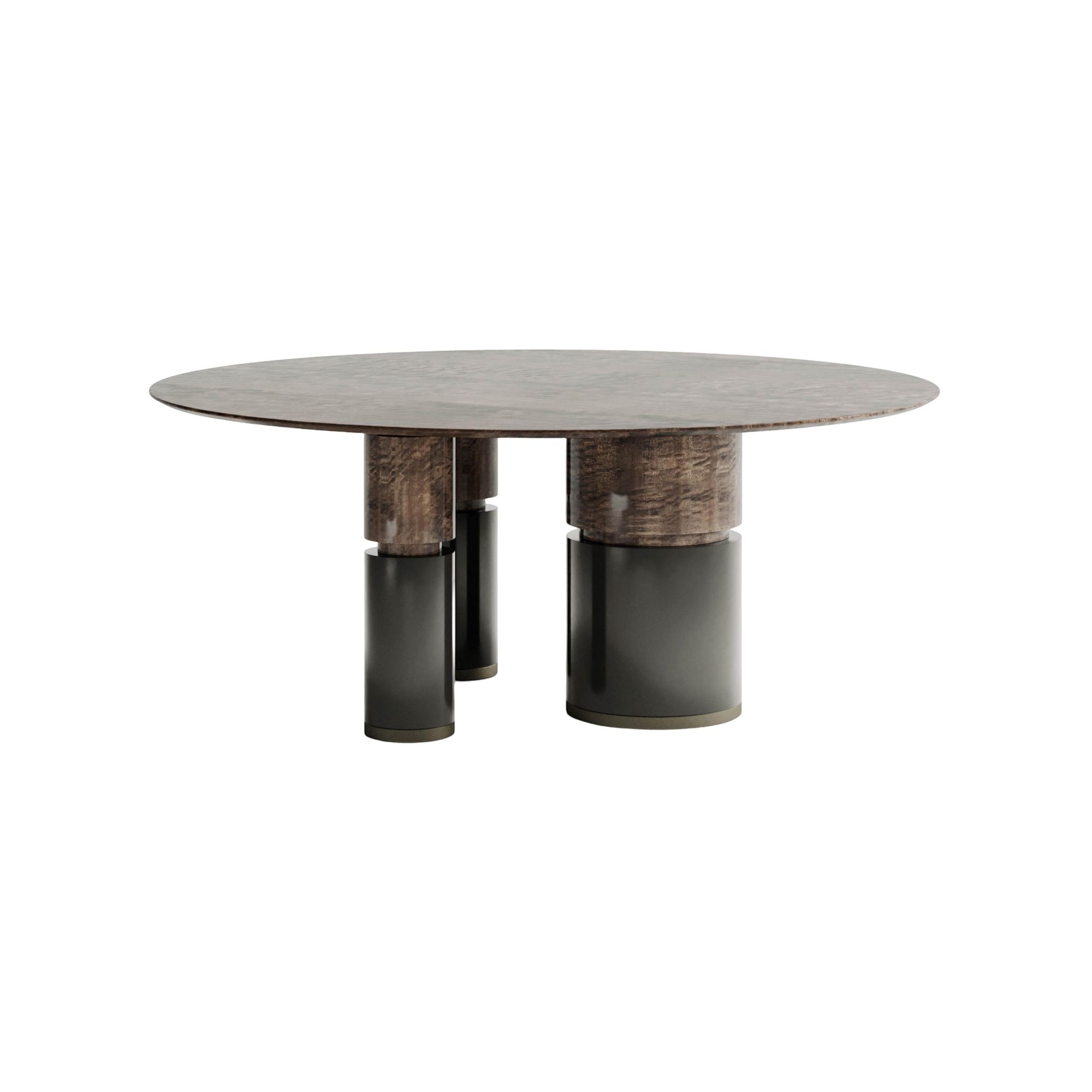 The Loïc round table is an elegant piece of furniture crafted by Capital, featuring bimaterial legs characterized by a first section in lacquered or polished or matte wood, and a second part in marble with metal finish details. These materials bestow the table with a timeless elegance and remarkable durability. This table is distinguished by its elegant and commanding design, and its color palette allows it to be effortlessly integrated into any environment or type of decor: whether placed at the entrance of a home, in a living room, or in a professional studio, Loïc is not just a piece of furniture, but a true object of style that reflects the personality and taste of its owner. Moreover, the table offers not only ample space to host many people but also projects a majestic image of design and craftsmanship. Its spacious center encourages conversation and sharing, making it ideal for dinners, family gatherings, or business meetings. Designed by Boatto Martino Studio.