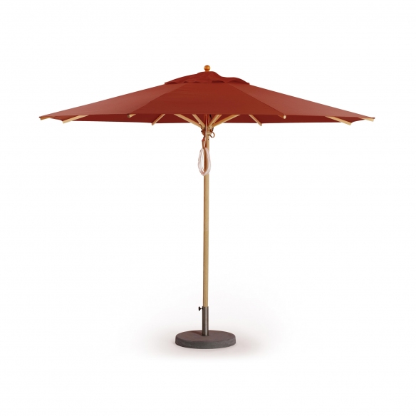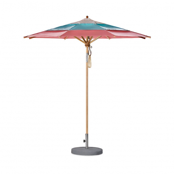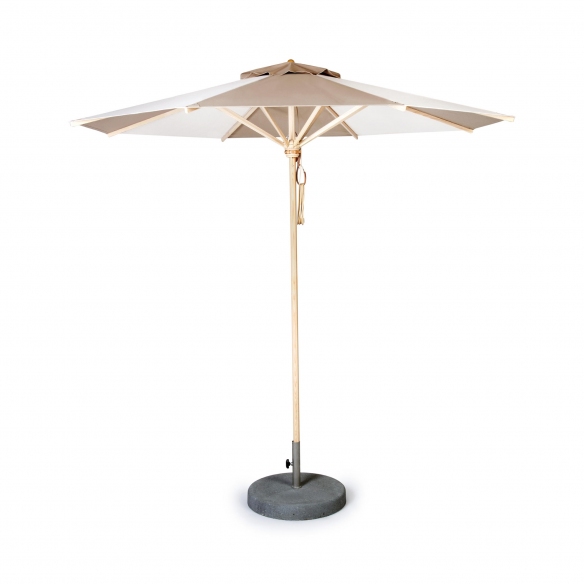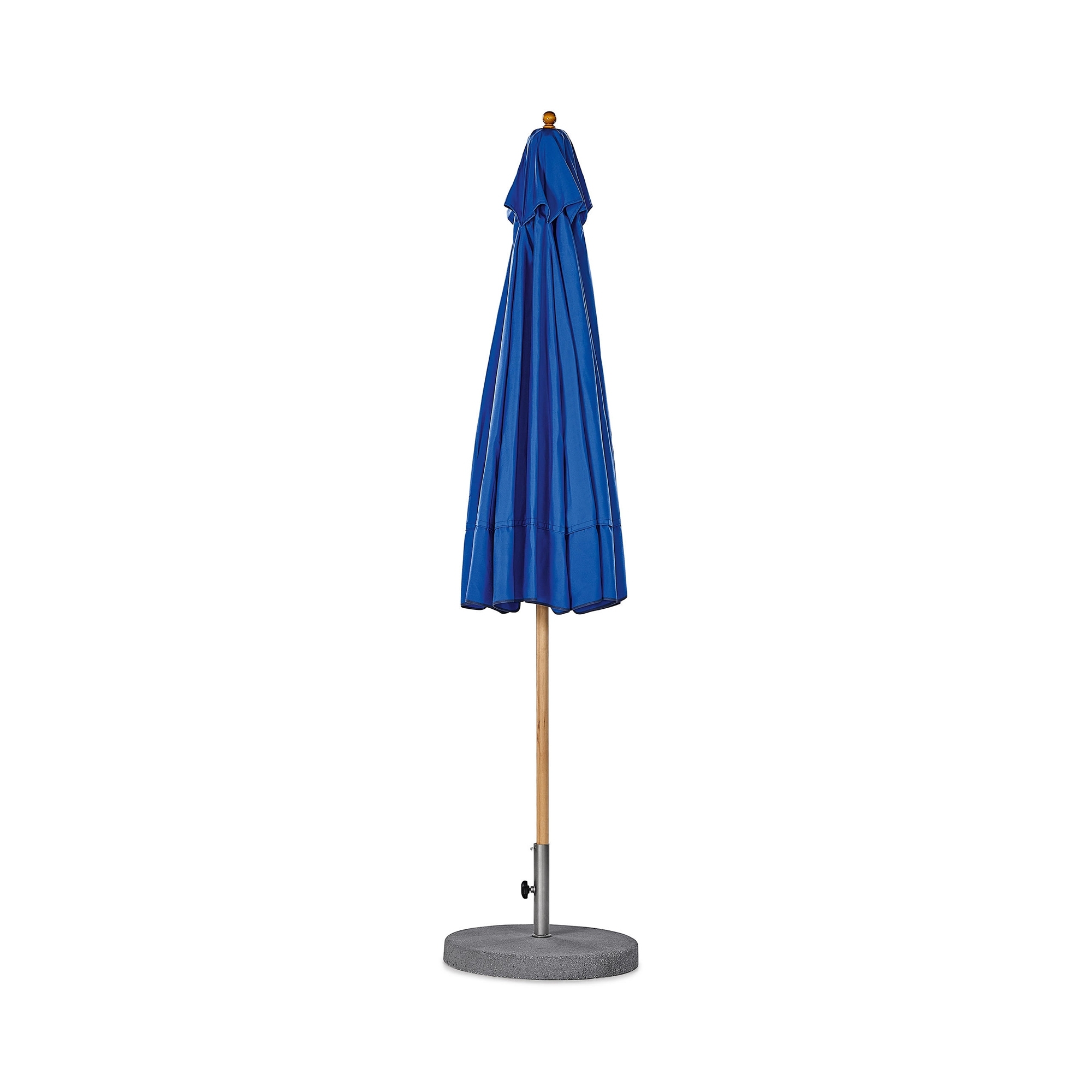 Klassiker round garden umbrella made with a concrete base, ash wood structure and outdoor acrylic fabric sunshade. Available in 7 sizes and in various color finishes, the Klassiker garden umbrella stands out for its aesthetic versatility: you can choose between different variants, including mixed, breeze, striped or ruffled ones, to find the umbrella that fits your outdoor space better. Do you want to make your umbrella even more unique? We offer the possibility of adding personalized writing on request, for an exclusive and distinctive touch. The solid structure of the Klassiker umbrella, made of solid ash with a protective finish, ensures resistance and stability. The pole, made of ash plywood, and the stainless steel links with folded leather straps increase durability and add elegant details to the umbrella. The acrylic fabric used for the canopy of the Klassiker umbrella is designed to resist bad weather, maintaining its beauty over time. UV protection and water resistance ensure that the color and structure of the fabric remain unchanged, even with prolonged outdoor use. The Klassiker doesn't stop there: upon request, a tilt mechanism can be integrated, to easily adjust the angle of the shade. Furthermore, every single component of the umbrella is replaceable, ensuring that your investment is long-lasting. Made by Weishäupl.