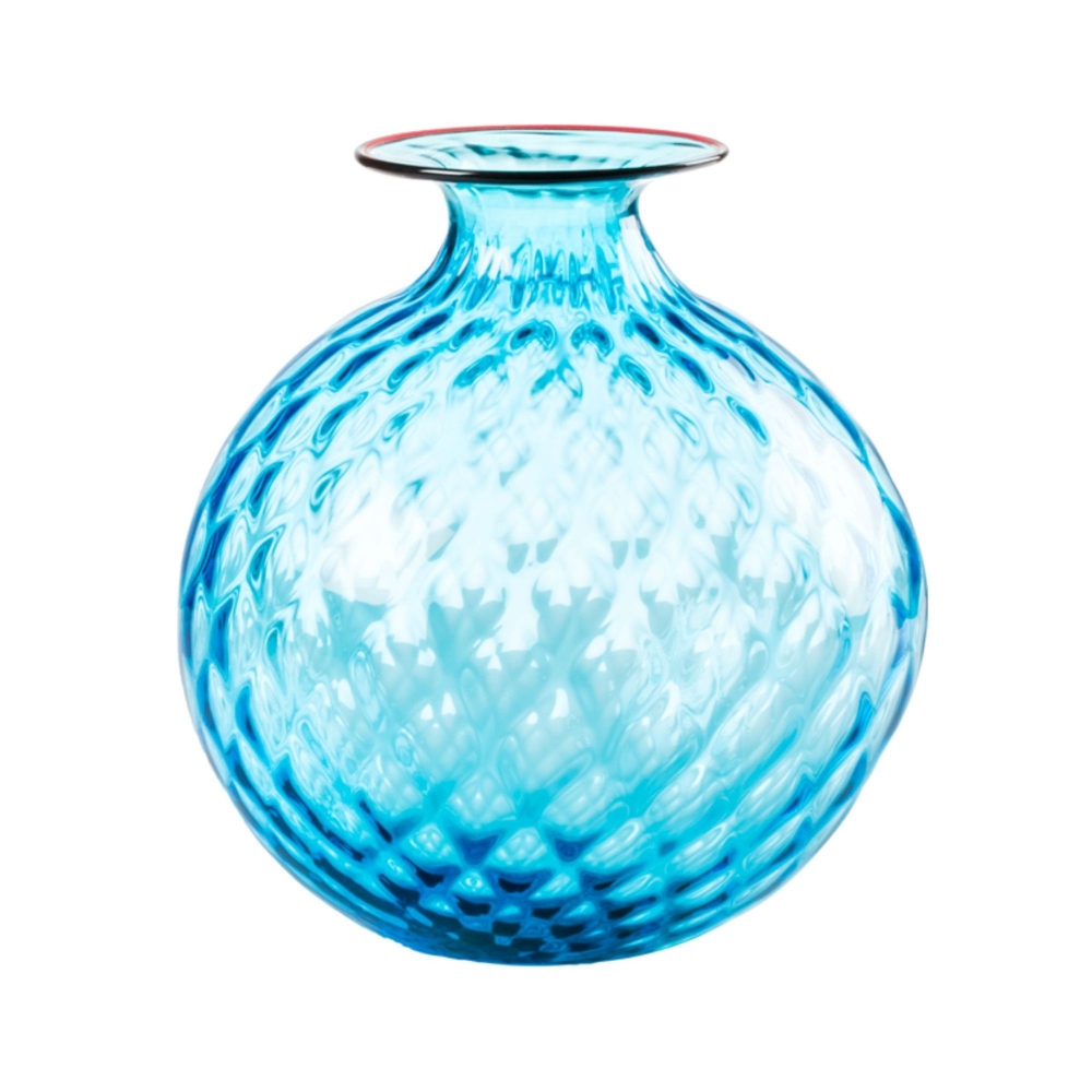 Monofiori Balloton vase made of handmade blown glass. With a height of 20.5 cm and a diameter of 18 cm, this amazing vase is available in 20 different colour combinations, all very sinewy with red mouthpieces. With small dimensions, Monofiori Balloton stands out in every type of environment and furnishing, giving them value and charming. Made and designed by Venini.