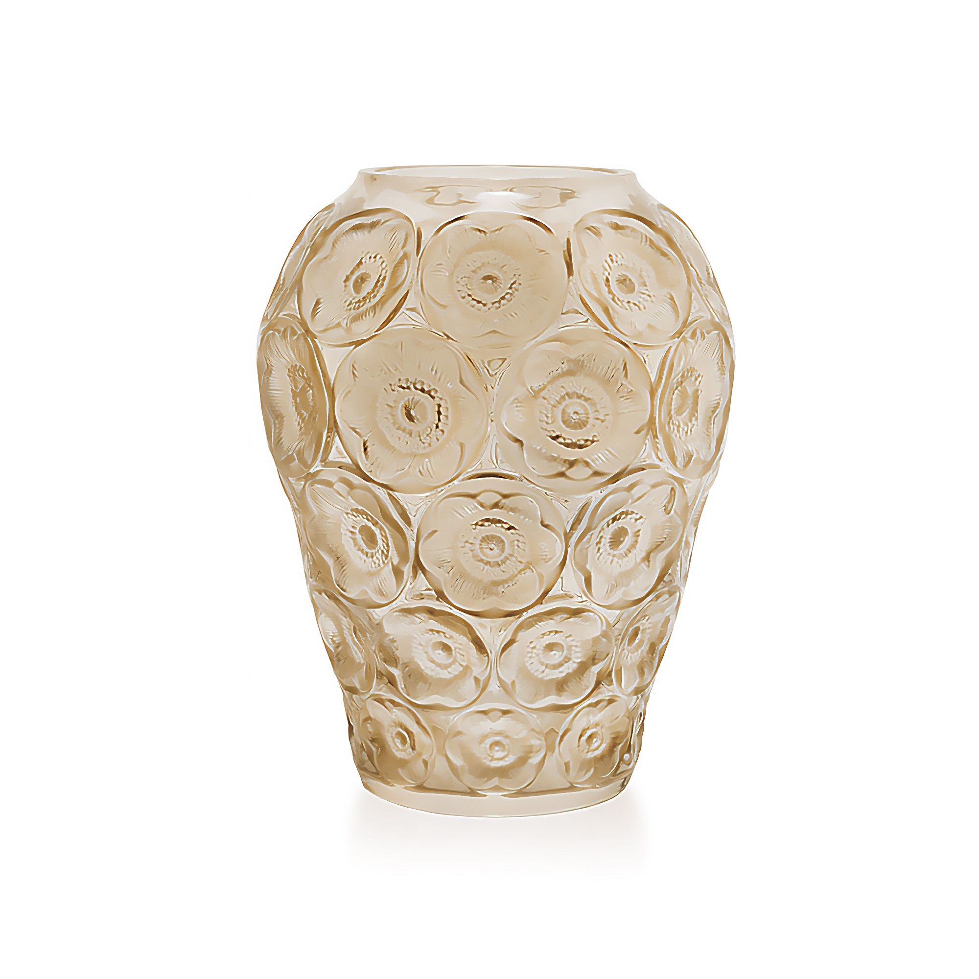 Anémones vase in the "Gold Luster" variant, made of crystal. An object of great charm and refinement, the Anémones vase represents anemones, flowers that symbolize purity and innocence, but also passion and sedition. An object that fully expresses the craftsmanship and artistic creativity of Lalique. Designed by René Lalique.