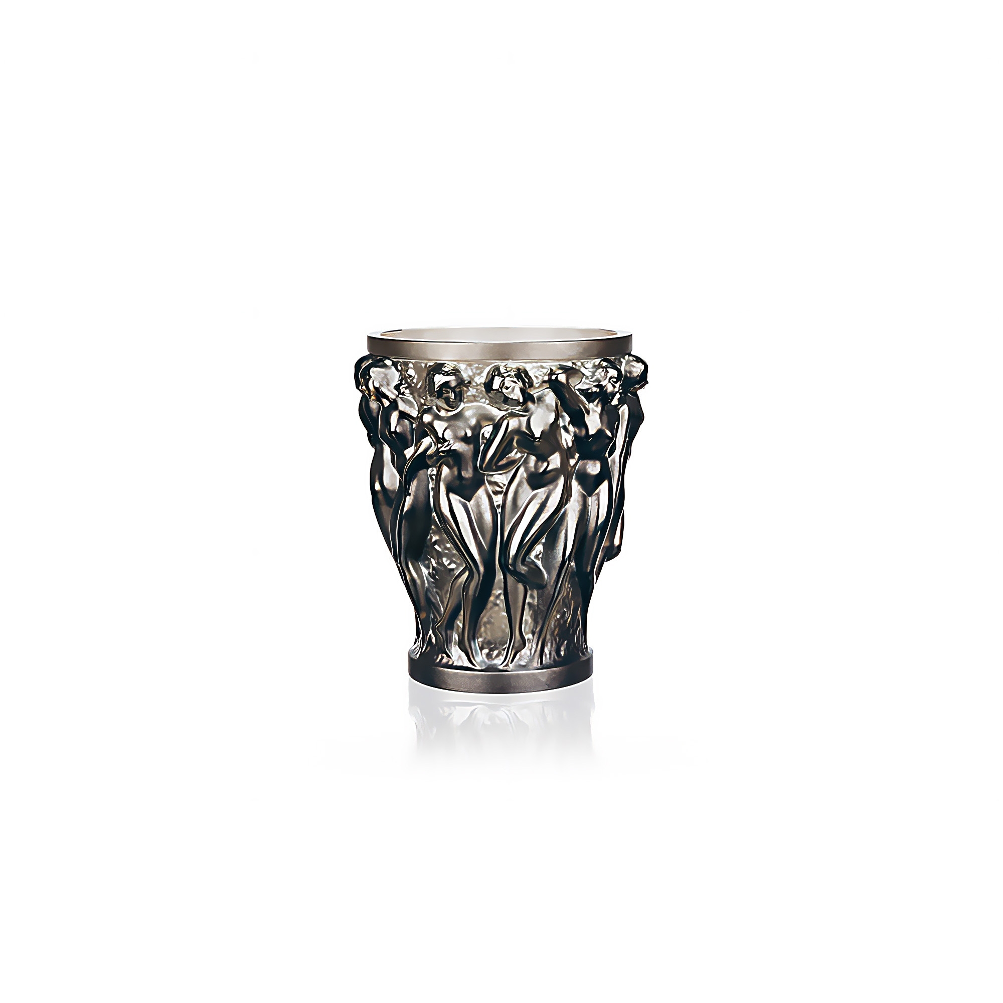 Small vase belonging to the Bacchantes collection in the "Bronze" version, made in crystal. An object of great luxury, the Bacchantes vase takes up the motif of the bacchantes, the young priestesses of Bacchus, represented with sculptural nudes in bas-relief, expressing an enveloping sensuality and an exuberant sensitivity. The satin crystal recalls the fineness of the leather, while the play of light gives life and movement to the cup. Designed by René Lalique.