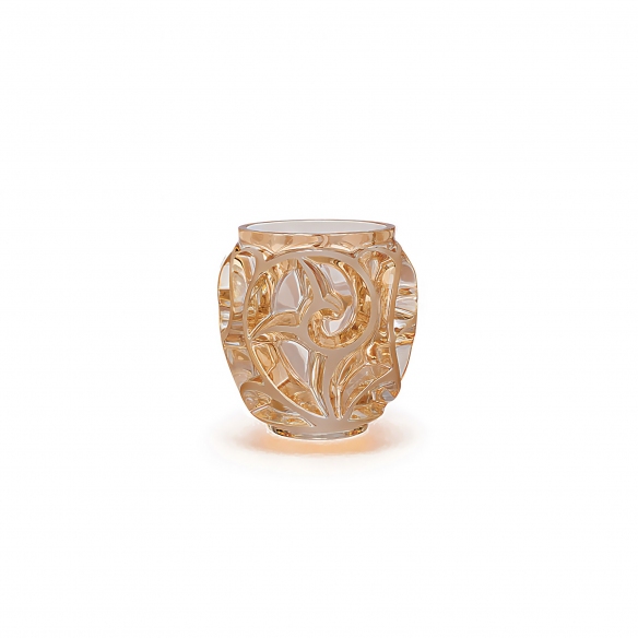 Small Tourbillons vase "Gold Luster" finish made of crystal. Featuring a bright and vibrant design, the Tourbillons vase features a motif inspired by the flowering of a fern, a plant that symbolizes life and movement. The quality of the crystal can be seen in its ability to reflect light, creating extremely romantic depth effects. Designed by René Lalique.