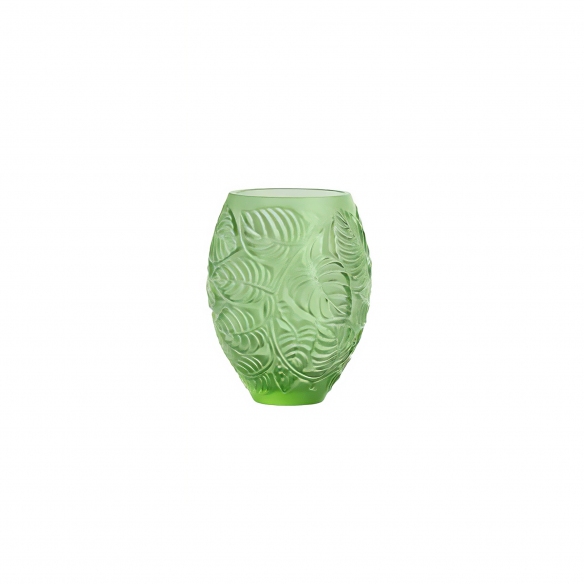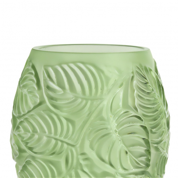 ?Feuilles vase in the "Green" finish made of crystal. Elegant and delicate, the Feuilles vase features a charming decoration of heart-shaped pepper leaves. The climbing vine, as a source of inspiration, dates back to René Lalique and Peugeot's salt and pepper mill design in 1924. Made by Lalique